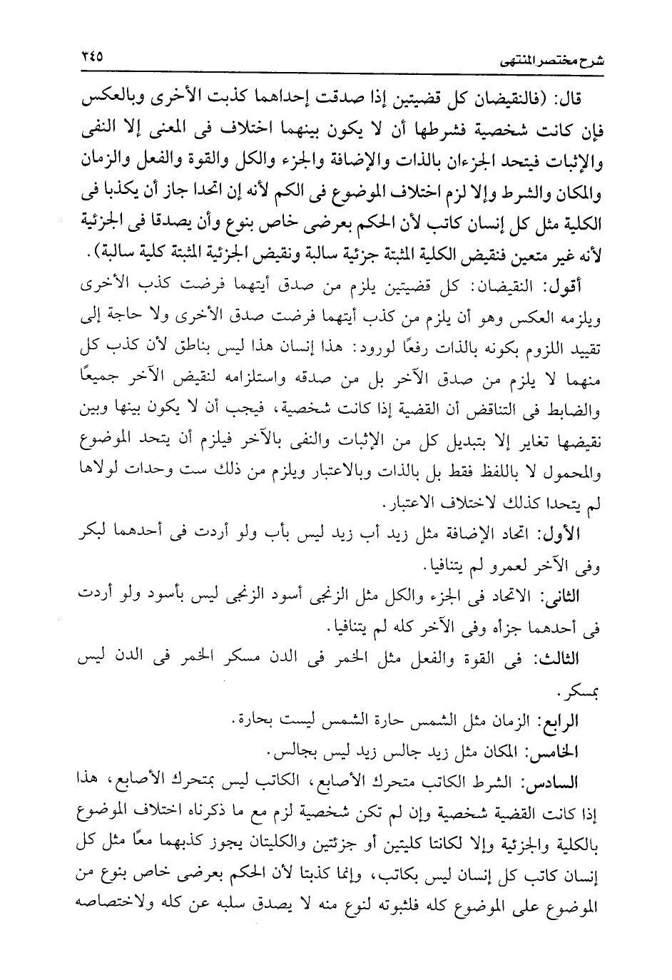 السادس: الشرط الكاتب متحرك الأصابع، الكاتب ليس بمتحرك الأصابع، هذا إذا كانت القضية شخصية وإن لم تكن شخصية لزم مع ما ذكرناه اختلاف الموضوع بالكلية والجزئية وإلا لكانتا كليتين أو جزئتين والكليتان يجوز كذبهما معًا مثل كل إنسان كاتب كل إنسان ليس بكاتب، وإنما كذبتا لأن الحكم بعرضى خاص بنوع من الموضوع على الموضوع كله فلثبوته لنوع منه لا يصدق سلبه عن كله ولاختصاصه