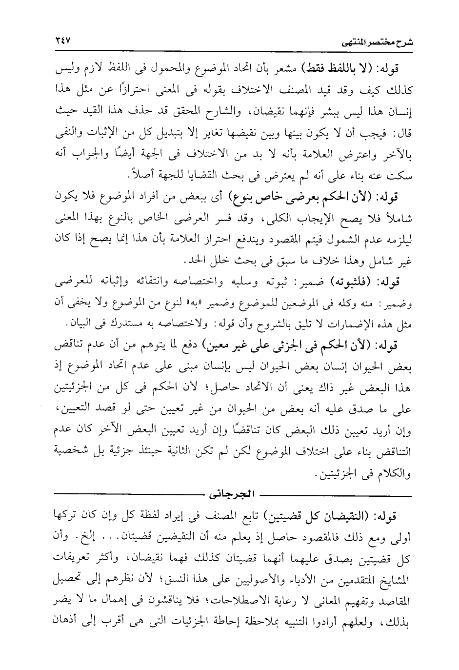 قوله: (لا باللفظ فقط) مشعر بأن اتحاد الموضوع والمحمول فى اللفظ لازم وليس كذلك كيف وقد قيد المصنف الاختلاف بقوله فى المعنى احترازًا عن مثل هذا إنسان هذا ليس ببشر فإنهما نقيضان، والشارح المحقق قد حذف هذا القيد حيث قال: فيجب أن لا يكون بينها وبين نقيضها تغاير إلا بتبديل كل من الإثبات والنفى بالآخر واعترض العلامة بأنه لا بد من الاختلاف فى الجهة أيضًا والجواب أنه سكت عنه بناء على أنه لم يعترض فى بحث القضايا للجهة أصلًا.