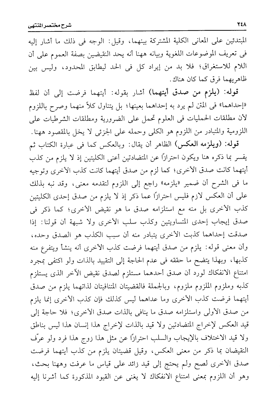 قوله: (ويلزمه العكس) الظاهر أن يقال: وبالعكس كما فى عبارة الكتاب ثم يفسر بما ذكره هنا ويكون احترازًا عن المتضادتين أعنى الكليتين إذ لا يلزم من كذب أيتهما كانت صدق الأخرى؛ كما لزم من صدق أيتهما كانت كذب الأخرى وتوجيه ما فى الشرح أن ضمير "يلزمه" راجع إلى اللزوم لتقدمه معنى، وقد نبه بذلك على أن العكس لازم فليس احترازًا عما ذكر إذ لا يلزم من صدق إحدى الكليتين كذب الأخرى بل منه مع استلزامه صدق ما هو نقيض الأخرى؛ كما ذكر فى صدق إيجاب إحدى المتساويتين وكذب سلب الأخرى ولا شبهة أن قولنا: إذا صدقت إحداهما كذبت الأخرى يتبادر منه أن سبب الكذب هو الصدق وحده، وأن معنى قوله: يلزم من صدق أيتهما فرضت كذب الأخرى أنه ينشأ ويتفرع منه كذبها، وبهذا يتضح ما حققه فى عدم الحاجة إلى التقييد بالذات ولو اكتفى بمجرد امتناع الانفكاك لورد أن صدق أحدهما مستلزم لصدق نقيض الآخر الذى يستلزم كذبه وملزوم الملزوم ملزوم، وبالجملة فالقضيتان المتنافيتان لذاتهما يلزم من صدق أيتهما فرضت كذب الأخرى وما عداهما ليس كذلك فإن كذب الأخرى إنما يلزم من صدق الأولى واستلزامه صدق ما ينافى بالذات صدق الأخرى؛ فلا حاجة إلى قيد العكس لإخراج المتضادتين ولا قيد بالذات لإخراج هذا إنسان هذا ليس بناطق ولا قيد الاختلاف بالإيجاب والسلب احترازًا عن مثل هذا زوج هذا فرد ولو عرّف النقيضان بما ذكر من معنى العكس، وقيل قضيتان يلزم من كذب أيتهما فرضت صدق الأخرى لصح ولم يحتج إلى قيد زائد على قياس ما عرفت وههنا بحث، وهو أن اللزوم بمعنى امتناع الانفكاك لا يغنى عن القيود المذكورة كما أشرنا إليه