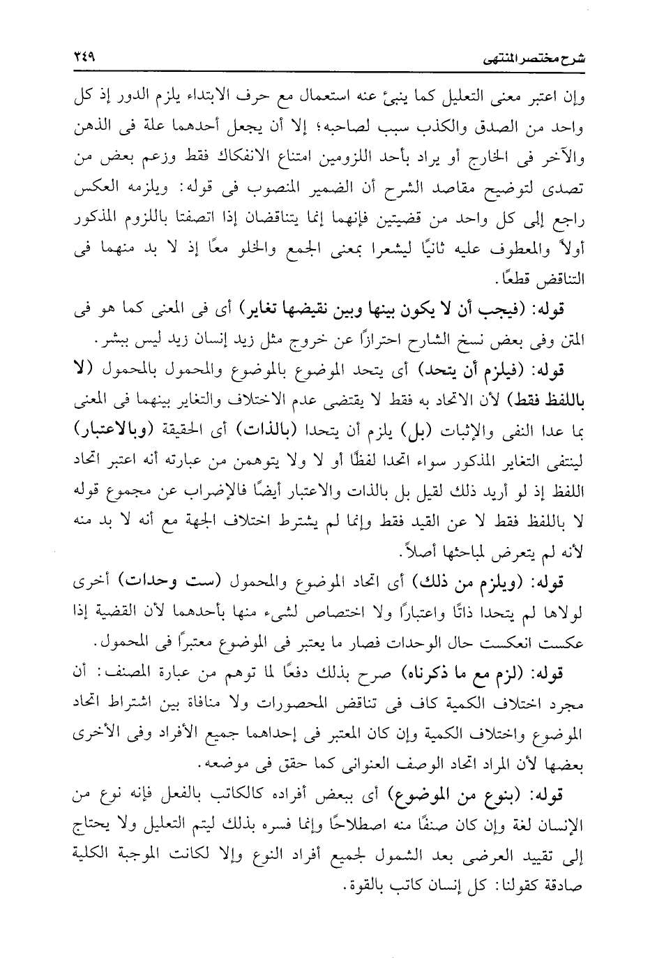 وإن اعتبر معنى التعليل كما ينبئ عنه استعمال مع حرف الابتداء يلزم الدور إذ كل واحد من الصدق والكذب سبب لصاحبه؛ إلا أن يجعل أحدهما علة فى الذهن والآخر فى الخارج أو يراد بأحد اللزومين امتناع الانفكاك فقط وزعم بعض من تصدى لتوضيح مقاصد الشرح أن الضمير المنصوب فى قوله: ويلزمه العكس راجع إلى كل واحد من قضيتين فإنهما إنما يتناقضان إذا اتصفتا باللزوم المذكور أولًا والمعطوف عليه ثانيًا ليشعرا بمعنى الجمع والخلو معًا إذ لا بد منهما فى التناقض قطعًا.