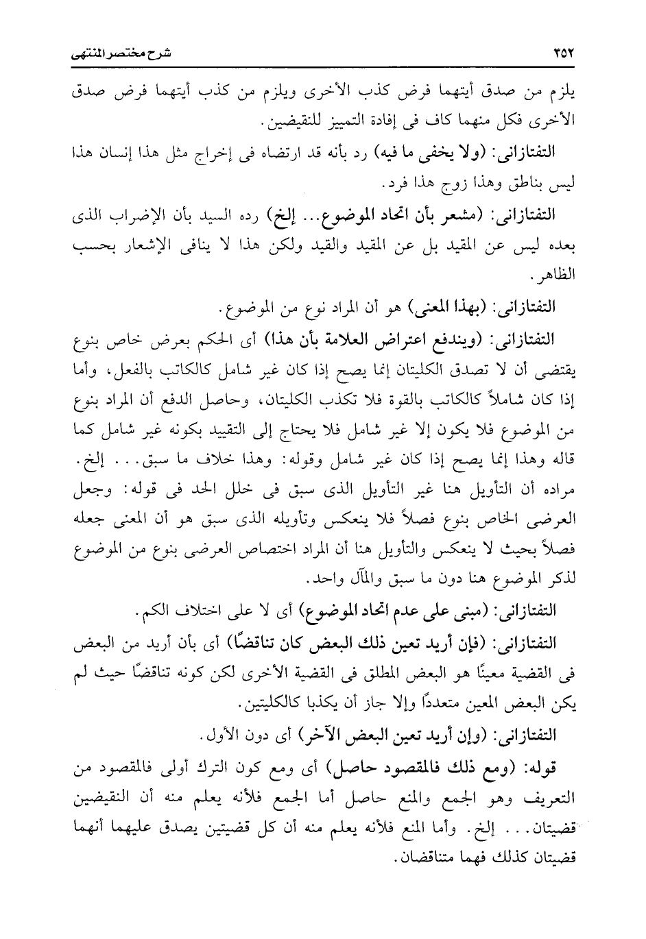 التفتازانى: (فإن أريد تعين ذلك البعض كان تناقضًا) أى بأن أريد من البعض فى القضية معينًا هو البعض المطلق فى القضية الأخرى لكن كونه تناقضًا حيث لم يكن البعض المعين متعددًا وإلا جاز أن يكذبا كالكليتين.