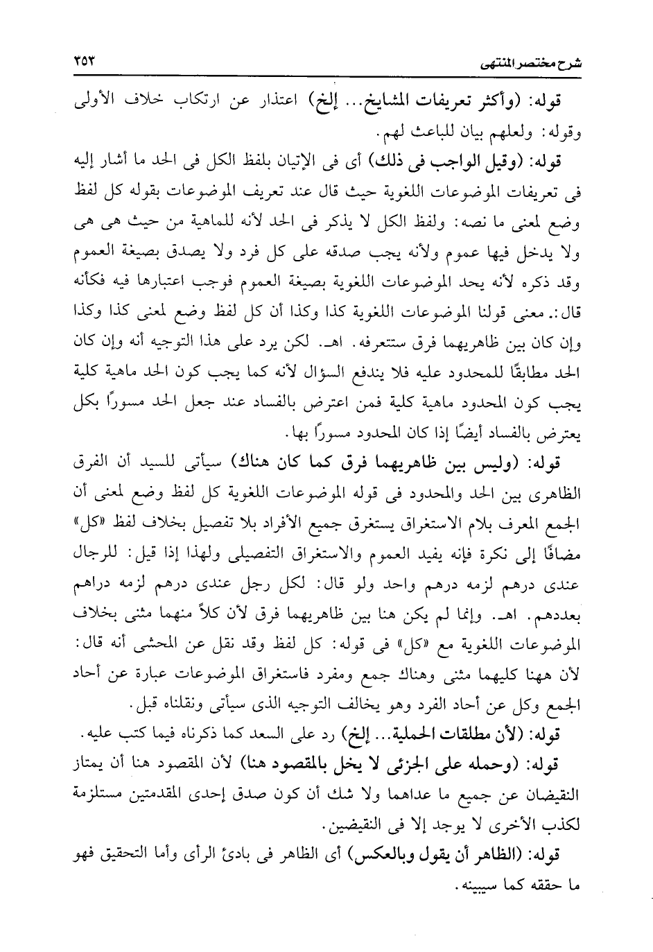 قوله: (وقيل الواجب فى ذلك) أى فى الإتيان بلفظ الكل فى الحد ما أشار إليه فى تعريفات الموضوعات اللغوية حيث قال عند تعريف الموضوعات بقوله كل لفظ وضع لمعنى ما نصه: ولفظ الكل لا يذكر فى الحد لأنه للمياهية من حيث هى هى ولا يدخل فيها عموم ولأنه يجب صدقه على كل فرد ولا يصدق بصيغة العموم وقد ذكره لأنه يحد الموضوعات اللغوية بصيغة العموم فوجب اعتبارها فيه فكأنه قال: معنى قولنا الموضوعات اللغوية كذا وكذا أن كل لفظ وضع لمعنى كذا وكذا وإن كان بين ظاهريهما فرق ستتعرفه. اهـ. لكن يرد على هذا التوجيه أنه وإن كان الحد مطابقًا للمحدود عليه فلا يندفع السؤال لأنه كما يجب كون الحد ماهية كلية يجب كون المحدود ماهية كلية فمن اعترض بالفساد عند جعل الحد مسورًا بكل يعترض بالفساد أيضًا إذا كان المحدود مسورًا بها.