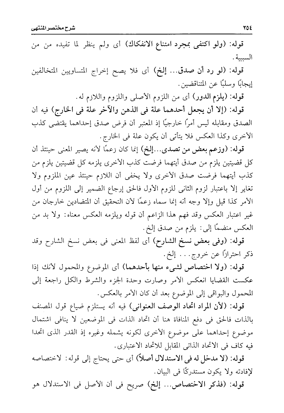 قوله: (إلا أن يجعل أحدهما علة فى الذهن والآخر علة فى الخارج) فيه أن الصدق ومقابله ليس أمرًا خارجيًا إذ المعتبر أن فرض صدق إحداهما يقتضى كذب الأخرى وكذا العكس فلا يتأتى أن يكون علة فى الخارج.