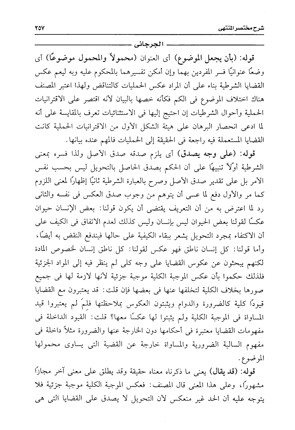 قوله: (بأن يجعل الموضوع) أى العنوان (محمولًا والمحمول موضوعًا) أى وضعًا عنوانيًا فسر المفردين بهما وإن أمكن تفسيرهما بالمحكوم عليه وبه ليعم عكس القضايا الشرطية بناء على أن المراد عكس الحمليات كالتناقض ولهذا اعتبر الصنف هناك اختلاف الموضوع فى الكم فكأنه خصها بالبيان لأنه اقتصر على الاقترانيات الحملية وأحوال الشرطيات إن احتيج إليها فى الاستثنائيات تعرف بالمقايسة على أنه لما ادعى انحصار البرهان على هيئة الشكل الأول من الاقترانيات الحملية كانت القضايا المستعملة فيه راجعة فى الحقيقة إلى الحمليات فالمهم عنده بيانها.
