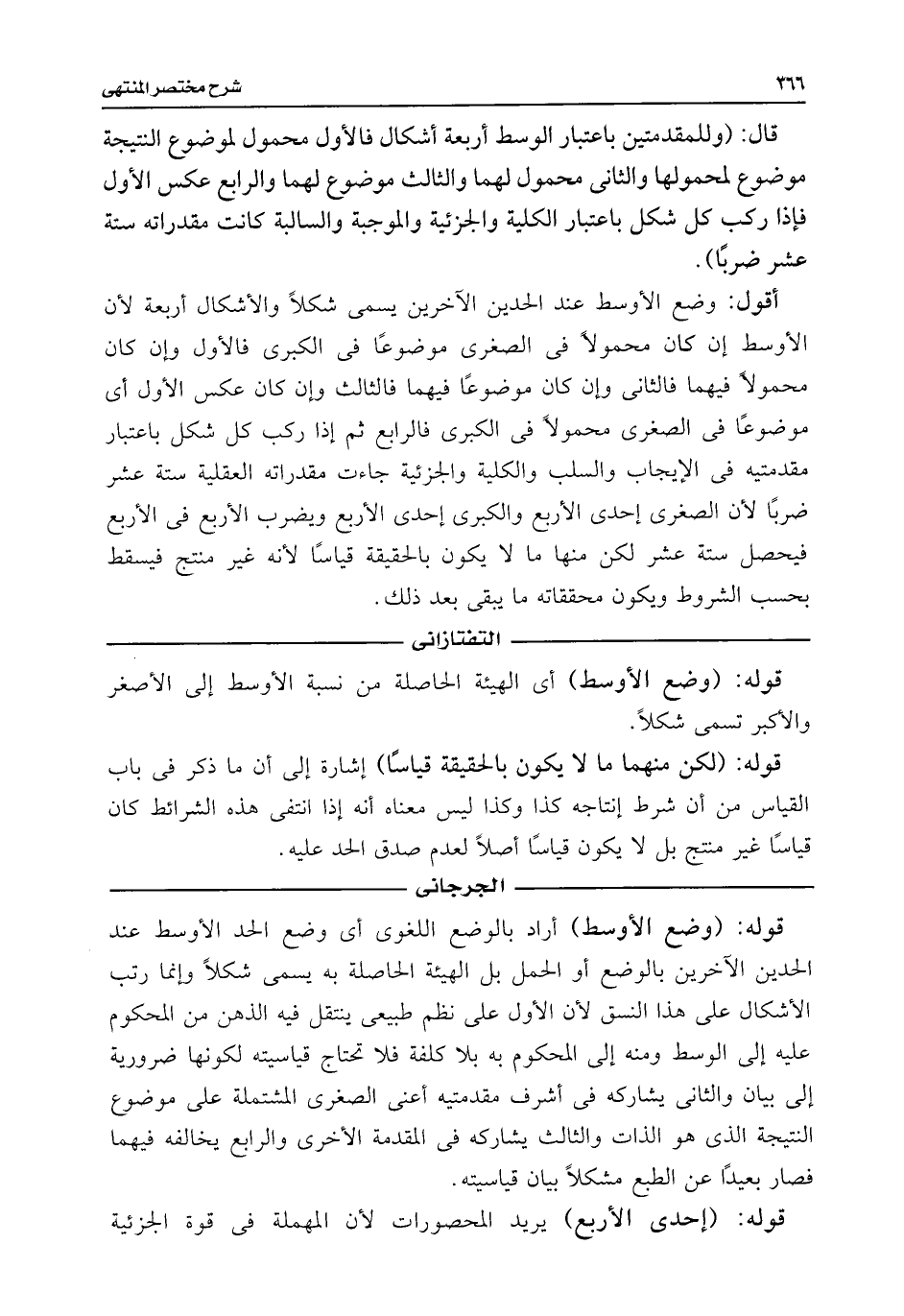 أقول: وضع الأوسط عند الحدين الآخرين يسمى شكلًا والأشكال أربعة لأن الأوسط إن كان محمولًا فى الصغرى موضوعًا فى الكبرى فالأول وإن كان محمولًا فيهما فالثانى وإن كان موضوعًا فيهما فالثالث وإن كان عكس الأول أى موضوعًا فى الصغرى محمولًا فى الكبرى فالرابع ثم إذا ركب كل شكل باعتبار مقدمتيه فى الإيجاب والسلب والكلية والجزئية جاءت مقدراته العقلية ستة عشر ضربًا لأن الصغرى إحدى الأربع والكبرى إحدى الأربع ويضرب الأربع فى الأربع فيحصل ستة عشر لكن منها ما لا يكون بالحقيقة قياسًا لأنه غير منتج فيسقط بحسب الشروط ويكون محققاته ما يبقى بعد ذلك.