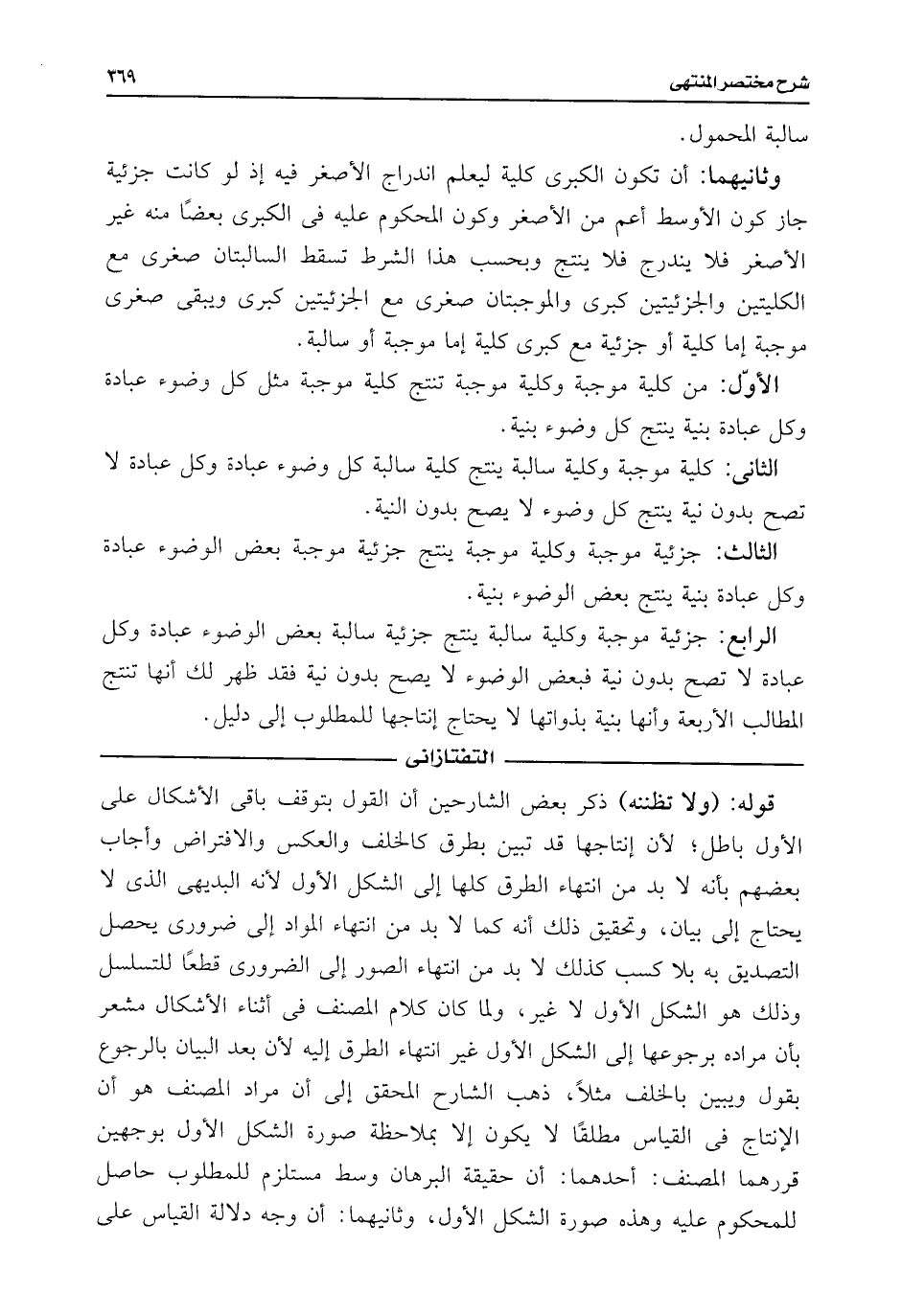 الرابع: جزئية موجبة وكلية سالبة ينتج جزئية سالبة بعض الوضوء عبادة وكل عبادة لا تصح بدون نية فبعض الوضوء لا يصح بدون نية فقد ظهر لك أنها تنتج المطالب الأربعة وأنها بنية بذواتها لا يحتاج إنتاجها للمطلوب إلى دليل.