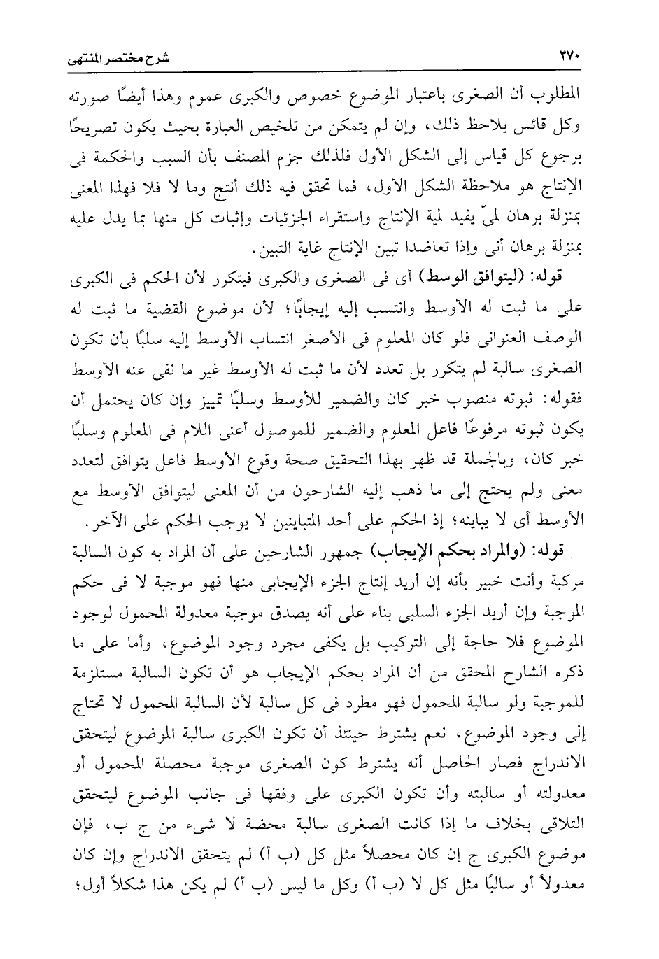 المطلوب أن الصغرى باعتبار الموضوع خصوص والكبرى عموم وهذا أيضًا صورته وكل قائس يلاحظ ذلك، وإن لم يتمكن من تلخيص العبارة بحيث يكون تصريحًا برجوع كل قياس إلى الشكل الأول فلذلك جزم المصنف بأن السبب والحكمة فى الإنتاج هو ملاحظة الشكل الأول، فما تحقق فيه ذلك أنتج وما لا فلا فهذا المعنى بمنزلة برهان لمىّ يفيد لمية الإنتاج واستقراء الجزئيات وإثبات كل منها بما يدل عليه بمنزلة برهان أنى وإذا تعاضدا تبين الإنتاج غاية التبين.
