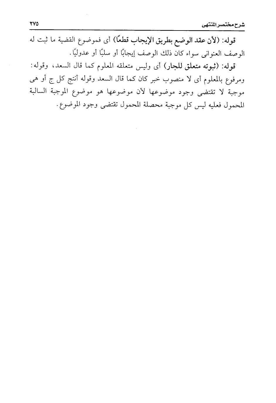 قوله: (ثبوته متعلق للجار) أى وليس متعلقه المعلوم كما قال السعد، وقوله: ومرفوع بالمعلوم أى لا منصوب خبر كان كما قال السعد وقوله أنتج كل ج أو هى موجبة لا تقتضى وجود موضوعها لأن موضوعها هو موضوع الموجبة السالبة المحمول فعليه ليس كل موجبة محصلة المحمول تقتضى وجود الموضوع.