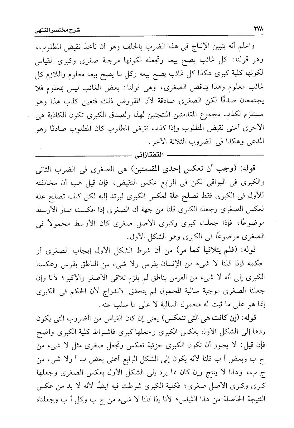 واعلم أنه يتبين الإنتاج فى هذا الضرب بالخلف وهو أن نأخذ نقيض المطلوب، وهو قولنا: كل غائب يصح بيعه وتجعله لكونها موجبة صغرى وكبرى القياس لكونها كلية كبرى هكذا كل غائب يصح بيعه وكل ما يصح بيعه معلوم واللازم كل غائب معلوم وهذا يناقض الصغرى، وهى قولنا: بعض الغائب ليس بمعلوم فلا يجتمعان صدقًا لكن الصغرى صادقة لأن المفروض ذلك فتعين كذب هذا وهو مستلزم لكذب مجموع المقدمتين المنتجتين لهذا ولصدق الكبرى تكون الكاذبة هى الأخرى أعنى نقيض المطلوب وإذا كذب نقيض المطلوب كان المطلوب صادقًا وهو المدعى وهكذا فى الضروب الثلاثة الأخر.