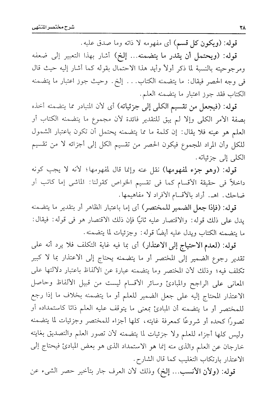 قوله: (لعدم الاحتياج إلى الاعتذار) أى بما فيه غاية التكلف فلا يرد أنه على تقدير رجوع الضمير إلى المختصر أو ما يتضمنه يحتاج إلى الاعتذار بما لا كبير تكلف فيه؛ وذلك لأن المختصر وما يتضمنه عبارة عن الألفاظ باعتبار دلالتها على المعاني على الراجح والمبادئ وسائر الأقسام ليست من قبيل الألفاظ وحاصل الاعتذار المحتاج إليه على جعل الضمير للعلم أو ما يتضمنه بخلاف ما إذا رجع للمختصر أو ما يتضمنه أن المبادئ بمعنى ما يتوقف عليه العلم ذاتا كاستمداده أو تصورًا كحده أو شروعًا كمعرفة غايته، كلها أجزاء للمختصر وجزئيات لما يتضمنه وليس كلها أجزاء للعلم ولا جزئيات لما يتضمنه لأن تصور العلم والتصديق بغايته خارجان عن العلم والذي منه إنما هو الاستمداد الذى هو بعض المبادئ فيحتاج إلى الاعتذار بارتكاب التغليب كما قال الشارح.