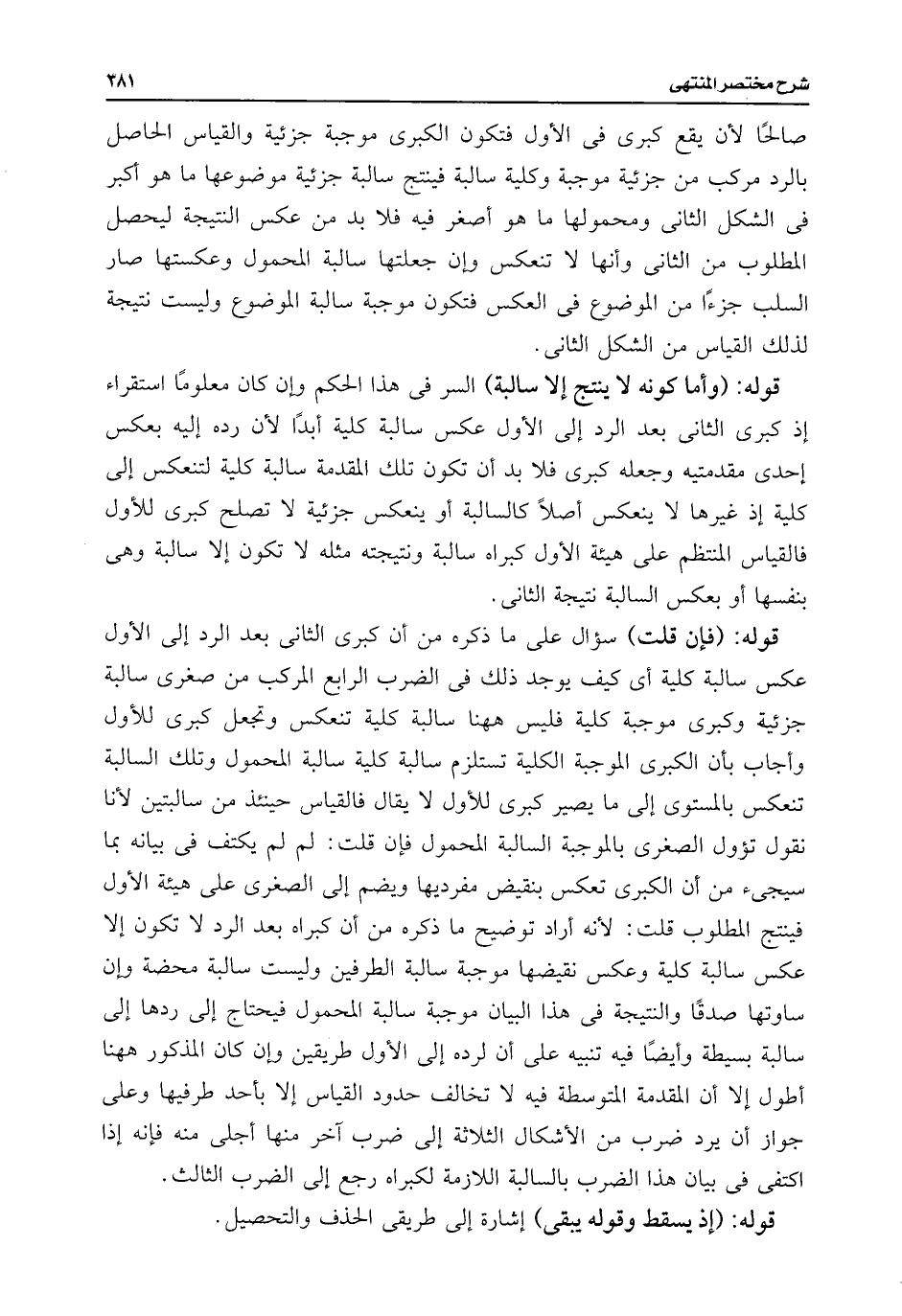 صالحًا لأن يقع كبرى فى الأول فتكون الكبرى موجبة جزئية والقياس الحاصل بالرد مركب من جزئية موجبة وكلية سالبة فينتج سالبة جزئية موضوعها ما هو أكبر فى الشكل الثانى ومحمولها ما هو أصغر فيه فلا بد من عكس النتيجة ليحصل المطلوب من الثانى وأنها لا تنعكس وإن جعلتها سالبة المحمول وعكستها صار السلب جزءًا من الموضوع فى العكس فتكون موجبة سالبة الموضوع وليست نتيجة لذلك القياس من الشكل الثانى.