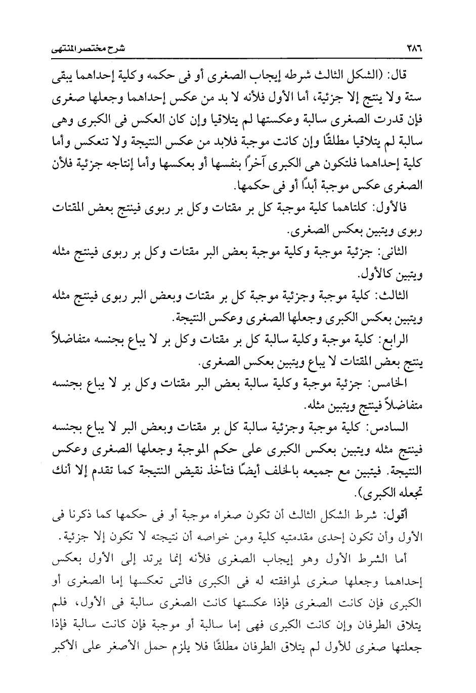 السادس: كلية موجبة وجزئية سالبة كل بر مقتات وبعض البر لا يباع بجنسه فينتج مثله ويتبين بعكس الكبرى على حكم الموجبة وجعلها الصغرى وعكس النتيجة. فيتبين مع جميعه بالخلف أيضًا فتأخذ نقيض النتيجة كما تقدم إلا أنك تجعله الكبرى).