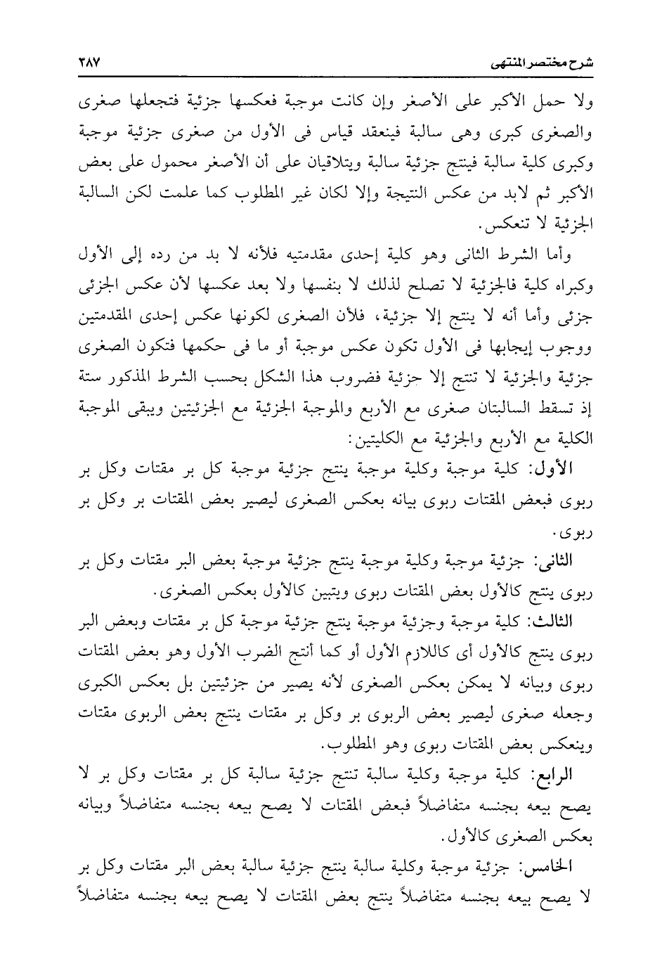 الخامس: جزئية موجبة وكلية سالبة ينتج جزئية سالبة بعض البر مقتات وكل بر لا يصح بيعه بجنسه متفاضلًا ينتج بعض القتات لا يصح بيعه بجنسه متفاضلًا