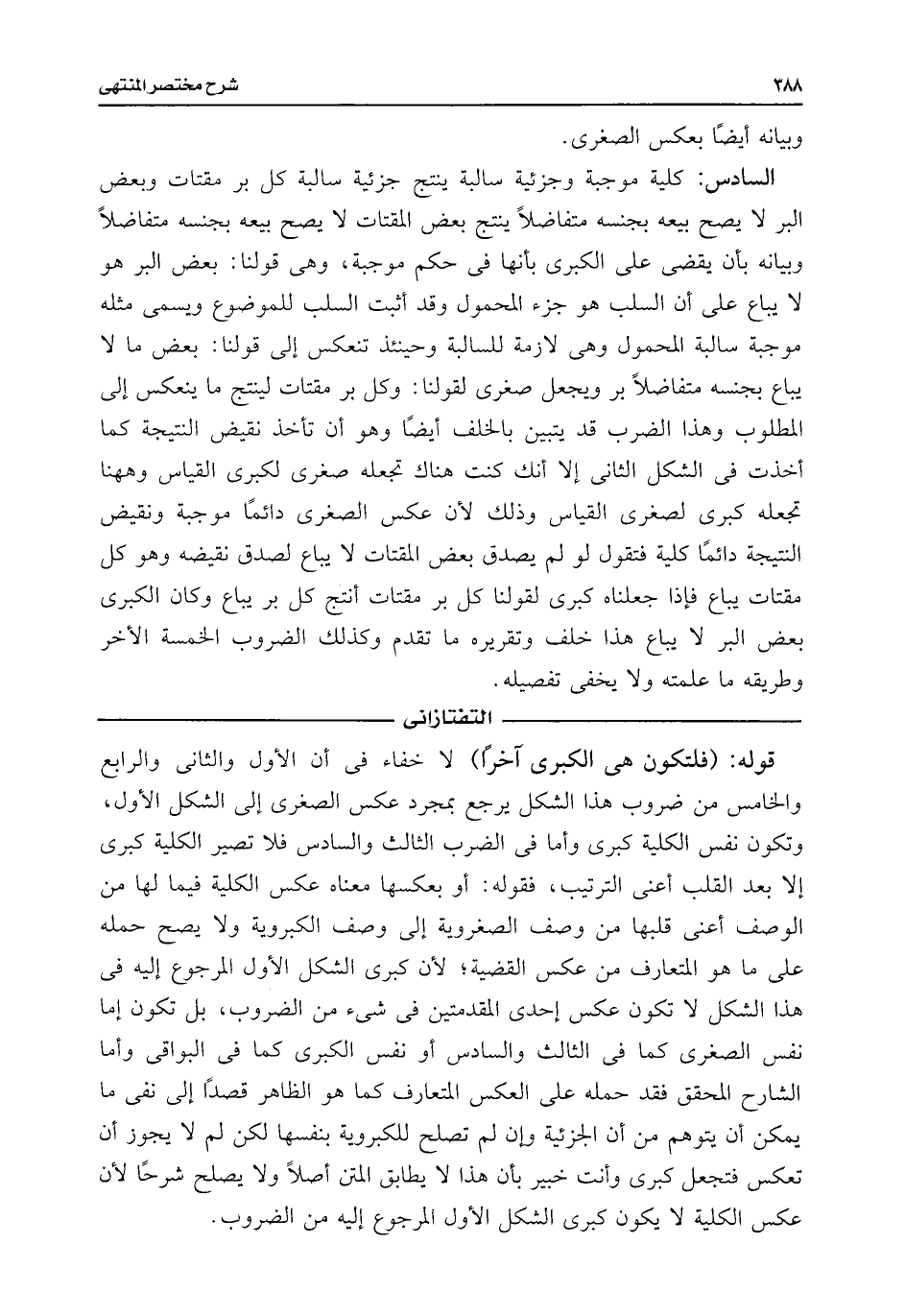 السادس: كلية موجبة وجزئية سالبة ينتج جزئية سالبة كل بر مقتات وبعض البر لا يصح بيعه بجنسه متفاضلًا ينتج بعض المقتات لا يصح بيعه بجنسه متفاضلًا وبيانه بأن يقضى على الكبرى بأنها فى حكم موجبة، وهى قولنا: بعض البر هو لا يباع على أن السلب هو جزء المحمول وقد أثبت السلب للموضوع ويسمى مثله موجبة سالبة المحمول وهى لازمة للسالبة وحينئذ تنعكس إلى قولنا: بعض ما لا يباع بجنسه متفاضلًا بر ويجعل صغرى لقولنا: وكل بر مقتات لينتج ما ينعكس إلى المطلوب وهذا الضرب قد يتبين بالخلف أيضًا وهو أن تأخذ نقيض النتيجة كما أخذت فى الشكل الثانى إلا أنك كنت هناك تجعله صغرى لكبرى القياس وههنا تجعله كبرى لصغرى القياس وذلك لأن عكس الصغرى دائمًا موجبة ونقيض النتيجة دائمًا كلية فتقول لو لم يصدق بعض القتات لا يباع لصدق نقيضه وهو كل مقتات يباع فإذا جعلناه كبرى لتمولنا كل بر مقتات أنتج كل بر يباع وكان الكبرى بعض البر لا يباع هذا خلف وتقريره ما تقدم وكذلك الضروب الخمسة الأخر وطريقه ما علمته ولا يخفى تفصيله.