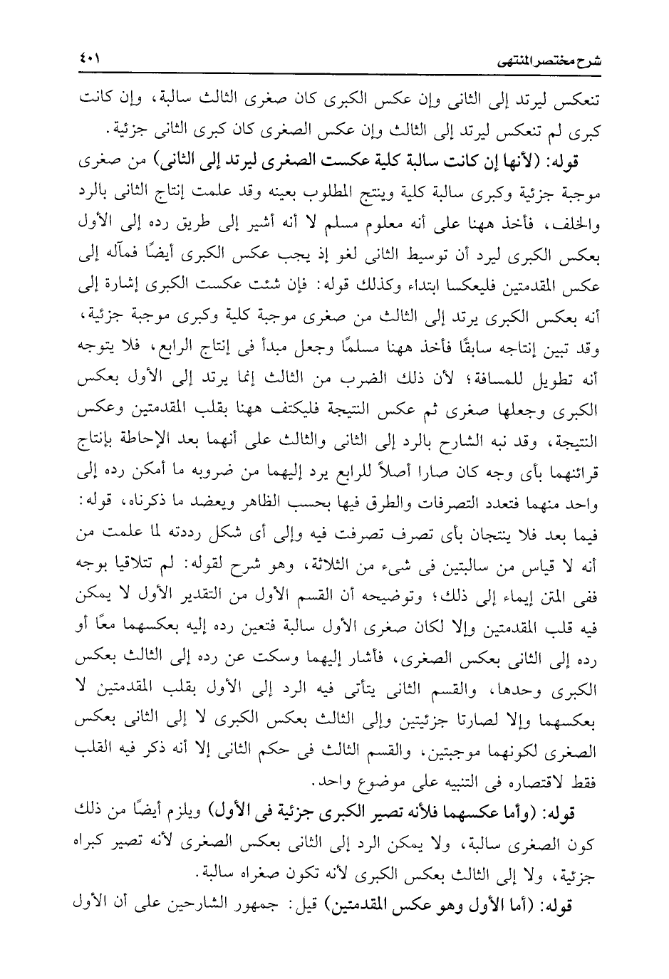 قوله: (لأنها إن كانت سالبةكلية عكست الصغرى ليرتد إلى الثانى) من صغرى موجبة جزئية وكبرى سالبة كلية وينتج المطلوب بعينه وقد علمت إنتاج الثانى بالرد والخلف، فأخذ ههنا على أنه معلوم مسلم لا أنه أشير إلى طريق رده إلى الأول بعكس الكبرى ليرد أن توسيط الثانى لغو إذ يجب عكس الكبرى أيضًا فمآله إلى عكس المقدمتين فليعكسا ابتداء وكذلك قوله: فإن شئت عكست الكبرى إشارة إلى أنه بعكس الكبرى يرتد إلى الثالث من صغرى موجبة كلية وكبرى موجبة جزئية، وقد تبين إنتاجه سابقًا فأخذ ههنا مسلمًا وجعل مبدأ فى إنتاج الرابع، فلا يتوجه أنه تطويل للمسافة؛ لأن ذلك الضرب من الثالث إنما يرتد إلى الأول بعكس الكبرى وجعلها صغرى ثم عكس النتيجة فليكتف ههنا بقلب المقدمتين وعكس النتيجة، وقد نبه الشارح بالرد إلى الثانى والثالث على أنهما بعد الإحاطة بإنتاج قرائنهما بأى وجه كان صارا أصلًا للرابع يرد إليهما من ضروبه ما أمكن رده إلى واحد منهما فتعدد التصرفات والطرق فيها بحسب الظاهر ويعضد ما ذكرناه، قوله: فيما بعد فلا ينتجان بأى تصرف تصرفت فيه وإلى أى شكل رددته لما علمت من أنه لا قياس من سالبتين فى شئ من الثلاثة، وهو شرح لقوله: لم تتلاقيا بوجه ففي المتن إيماء إلى ذلك؛ وتوضيحه أن القسم الأول من التقدير الأول لا يمكن فيه قلب المقدمتين وإلا لكان صغرى الأول سالبة فتعين رده إليه بعكسهما معًا أو رده إلى الثانى بعكس الصغرى، فأشار إليهما وسكت عن رده إلى الثالث بعكس الكبرى وحدها، والقسم الثانى يتأتى فيه الرد إلى الأول بقلب المقدمتين لا بعكسهما وإلا لصارتا جزئيتين وإلى الثالث بعكس الكبرى لا إلى الثانى بعكس الصغرى لكونهما موجبتين، والقسم الثالث فى حكم الثانى إلا أنه ذكر فيه القلب فقط لاقتصاره فى التنبيه على موضوع واحد.
