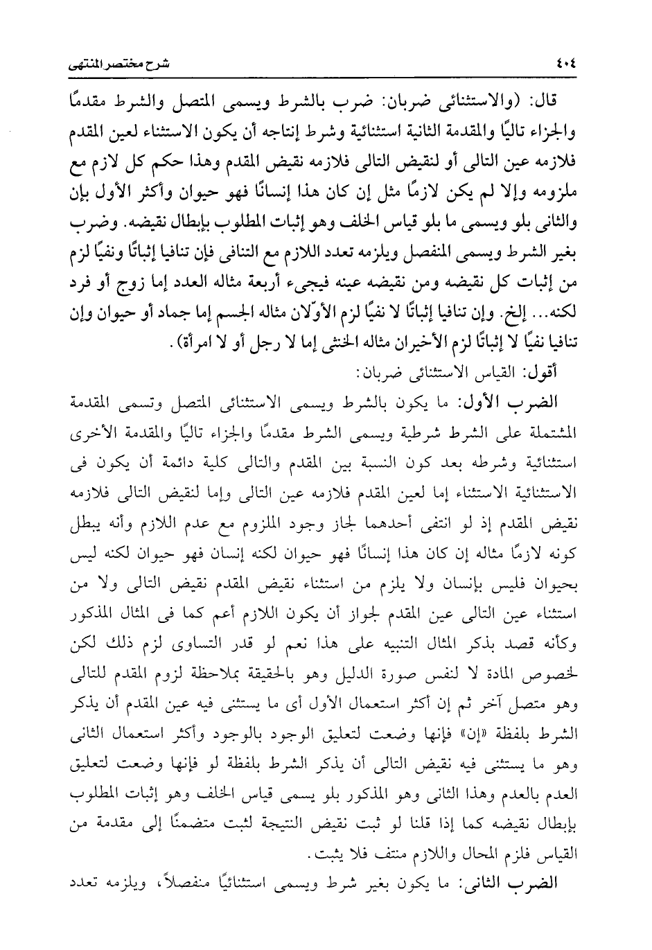قال: (والاستثنائى ضربان: ضرب بالشرط ويسمى المتصل والشرط مقدمًا والجزاء تاليًا والمقدمة الثانية استثنائية وشرط إنتاجه أن يكون الاستثناء لعين المقدم فلازمه عين التالى أو لنقيض التالى فلازمه نقيض المقدم وهذا حكم كل لازم مع ملزومه وإلا لم يكن لازمًا مثل إن كان هذا إنسانًا فهو حيوان وأكثر الأول بإن والثانى بلو ويسمى ما بلو قياس الخلف وهو إثبات المطلوب بإبطال نقيضه. وضرب بغير الشرط ويسمى المنفصل ويلزمه تعدد اللازم مع التنافى فإن تنافيا إثباتًا ونفيًا لزم من إثبات كل نقيضه ومن نقيضه عينه فيجئ أربعة مثاله العدد إما زوج أو فرد لكنه. . . إلخ. وإن تنافيا إثباتًا لا نفيًا لزم الأولان مثاله الجسم إما جماد أو حيوان وإن تنافيا نفيًا لا إثباتًا لزم الأخيران مثاله الخنثى إما لا رجل أو لا امرأة).