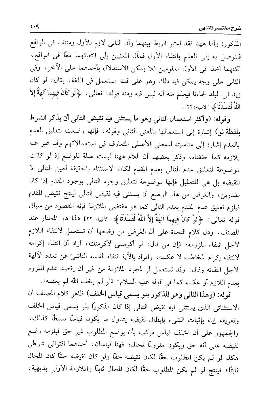 المذكورة وأما ههنا فقد اعتبر الربط بينهما وأن الثانى لازم للأول ومنتف فى الواقع فيتوصل به إلى العلم بانتنهاء الأول فمآل المعنيين إلى انتنهائهيا معًا فى الواقع، لكنهما أخذا فى الأول معلومين فلا يمكن الاستدلال بأحدهما على الآخر، وفى الثانى على وجه يمكن فيه ذلك وهو على قلته مستعمل فى اللغة، يقال: لو كان زيد فى البلد لجاءنا فيعلم منه أنه ليس فيه ومنه قوله: تعالى: {لَوْ كَانَ فِيهِمَا آلِهَةٌ إِلَّا اللَّهُ لَفَسَدَتَا} [الأنبياء: ٢٢].