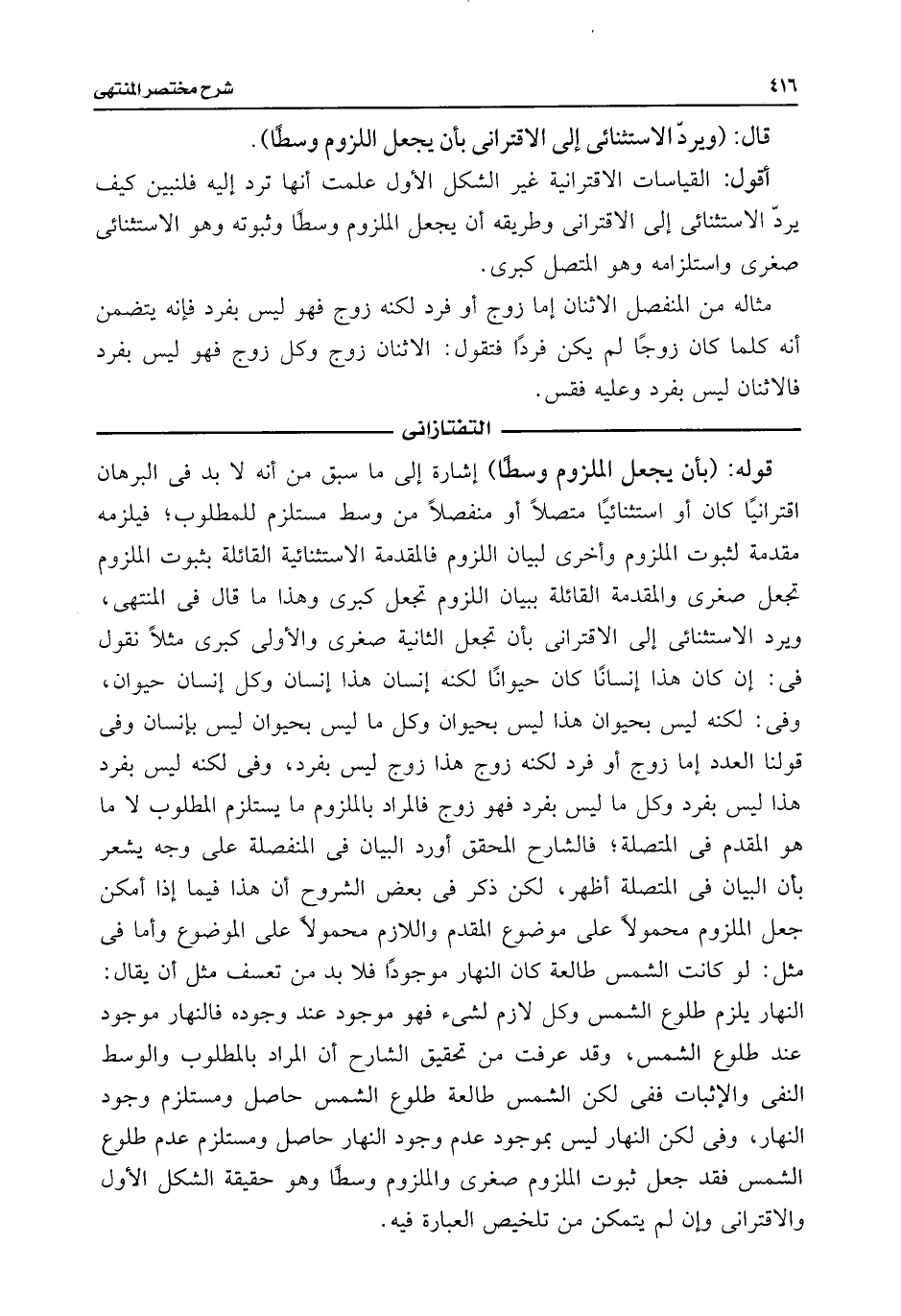 قوله: (بأن يجعل الملزوم وسطًا) إشارة إلى ما سبق من أنه لا بد فى البرهان اقترانيًا كان أو استثنائيًا متصلًا أو منفصلًا من وسط مستلزم للمطلوب؛ فيلزمه مقدمة لثبوت الملزوم وأخرى لبيان اللزوم فالمقدمة الاستثنائية القائلة بثبوت الملزوم تجعل صغرى والمقدمة القائلة ببيان اللزوم تجعل كبرى وهذا ما قال فى المنتهى، ويرد الاستثنائى إلى الاقترانى بأن تجعل الثانية صغرى والأولى كبرى مثلًا نقول فى: إن كان هذا إنسانًا كان حيوانًا لكنه إنسان هذا إنسان وكل إنسان حيوان، وفى: لكنه ليس بحيوان هذا ليس بحيوان وكل ما ليس بحيوان ليس بإنسان وفى قولنا العدد إما زوج أو فرد لكنه زوج هذا زوج ليس بفرد، وفى لكنه ليس بفرد هذا ليس بفرد وكل ما ليس بفرد فهو زوج فالمراد بالملزوم ما يستلزم المطلوب لا ما هو المقدم فى المتصلة؛ فالشارح المحقق أورد البيان فى المنفصلة على وجه يشعر بأن البيان فى المتصلة أظهر، لكن ذكر فى بعض الشروح أن هذا فيما إذا أمكن جعل الملزوم محمولًا على موضوع المقدم واللازم محمولًا على الموضوع وأما فى مثل: لو كانت الشمس طالعة كان النهار موجودًا فلا بد من تعسف مثل أن يقال: النهار يلزم طلوع الشمس وكل لازم لشئ فهو موجود عند وجوده فالنهار موجود عند طلوع الشمس، وقد عرفت من تحقيق الشارح أن المراد بالمطلوب والوسط النفى والإثبات ففي لكن الشمس طالعة طلوع الشمس حاصل ومستلزم وجود النهار، وفى لكن النهار ليس بموجود عدم وجود النهار حاصل ومستلزم عدم طلوع الشمس فقد جعل ثبوت الملزوم صغرى والملزوم وسطًا وهو حقيقة الشكل الأول والاقترانى وإن لم يتمكن من تلخيص العبارة فيه.