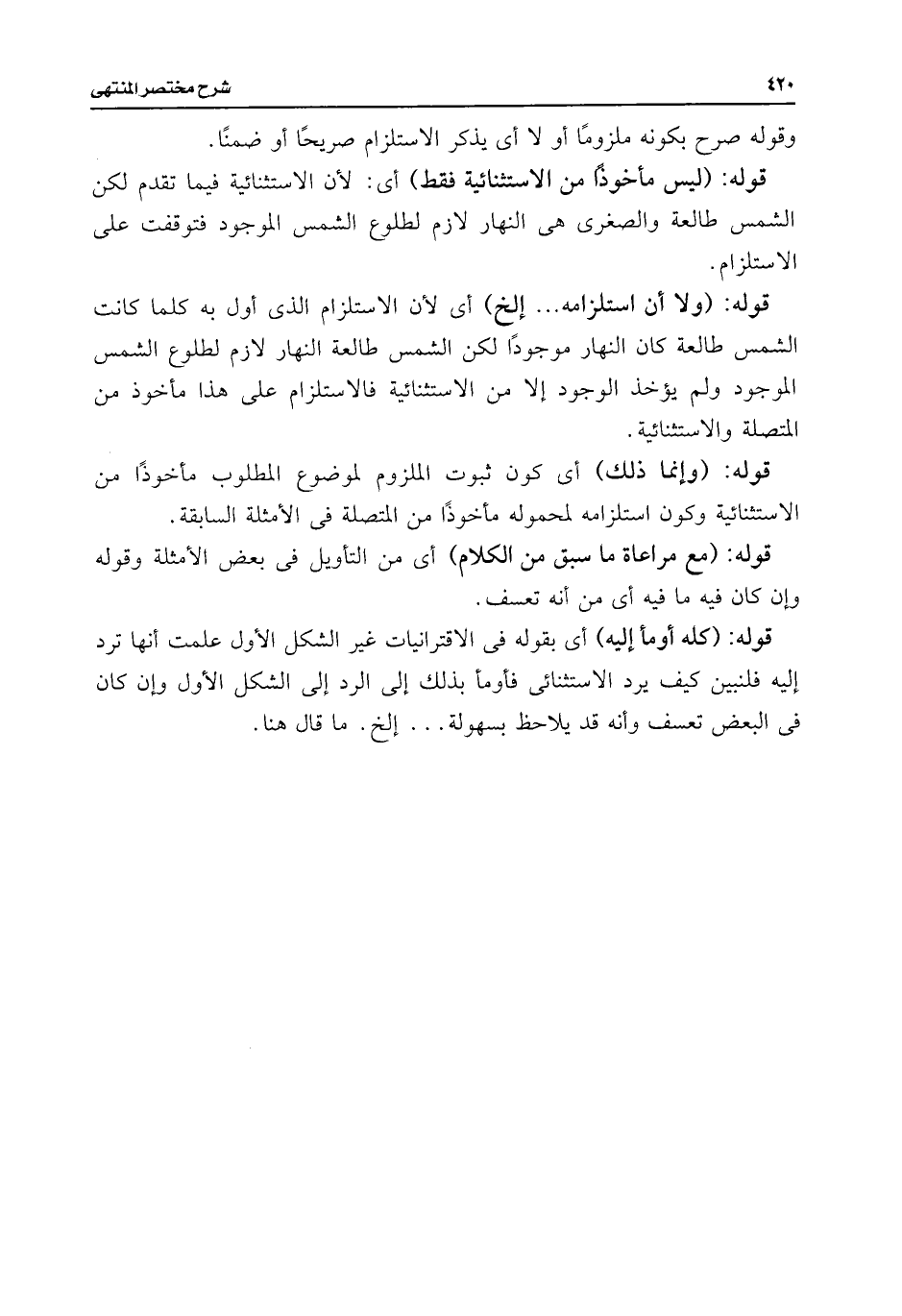 قوله: (ليس مأخوذًا من الاستثنائية فقط) أى: لأن الاستثنائية فيما تقدم لكن الشمس طالعة والصغرى هى النهار لازم لطلوع الشمس الموجود فتوقفت على الاستلزام.