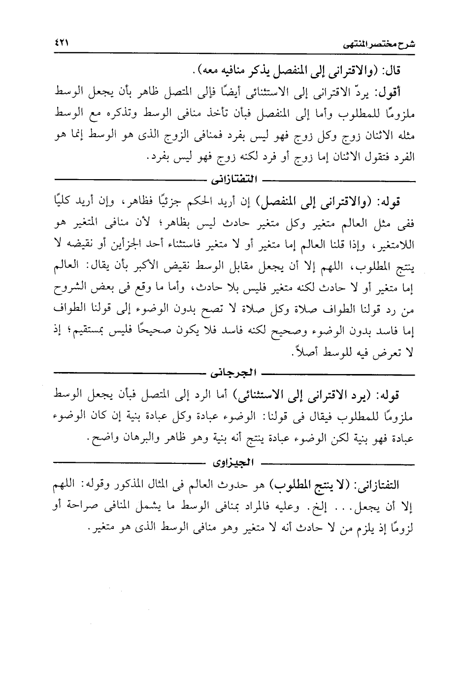 التفتازانى: (لا ينتج المطلوب) هو حدوث العالم فى المثال المذكور وقوله: اللهم إلا أن يجعل. . . إلخ. وعليه فالمراد بمنافى الوسط ما يشمل المنافى صراحة أو لزومًا إذ يلزم من لا حادث أنه لا متغير وهو منافى الوسط الذى هو متغير.