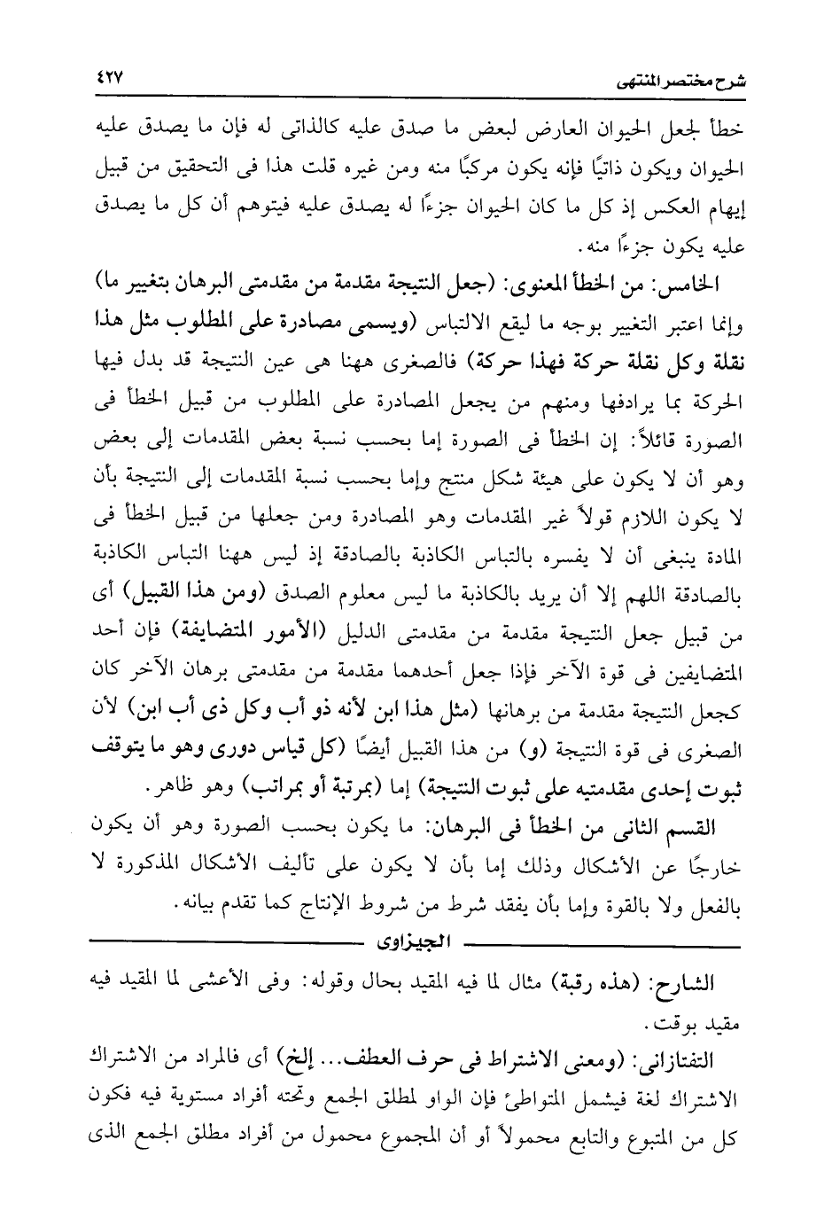 الخامس: من الخطأ المعنوى: (جعل النتيجة مقدمة من مقدمتى البرهان بتغيير ما) وإنما اعتبر التغيير بوجه ما ليقع الالتباس (ويسمى مصادرة على المطلوب مثل هذا نقلة وكل نقلة حركة فهذا حركة) فالصغرى ههنا هى عين النتيجة قد بدل فيها الحركة بما يرادفها ومنهم من يجعل الصادرة على المطلوب من قبيل الخطأ فى الصورة قائلًا: إن الخطأ فى الصورة إما بحسب نسبة بعض المقدمات إلى بعض وهو أن لا يكون على هيئة شكل منتج وإما بحسب نسبة المقدمات إلى النتيجة بأن لا يكون اللازم قولًا غير المقدمات وهو المصادرة ومن جعلها من قبيل الخطأ فى المادة ينبغى أن لا يفسره بالتباس الكاذبة بالصادقة إذ ليس ههنا التباس الكاذبة بالصادقة اللهم إلا أن يريد بالكاذبة ما ليس معلوم الصدق (ومن هذا القبيل) أى من قبيل جعل النتيجة مقدمة من مقدمتى الدليل (الأمور المتضايفة) فإن أحد المتضايقين فى قوة الآخر فإذا جعل أحدهما مقدمة من مقدمتى برهان الآخر كان كجعل النتيجة مقدمة من برهانها (مثل هذا ابن لأنه ذو أب وكل ذى أب ابن) لأن الصغرى فى قوة النتيجة (و) من هذا القبيل أيضًا (كل قياس دورى وهو ما يتوقف ثبوت إحدى مقدمتيه على ثبوت النتيجة) إما (بمرتبة أو بمراتب) وهو ظاهر.