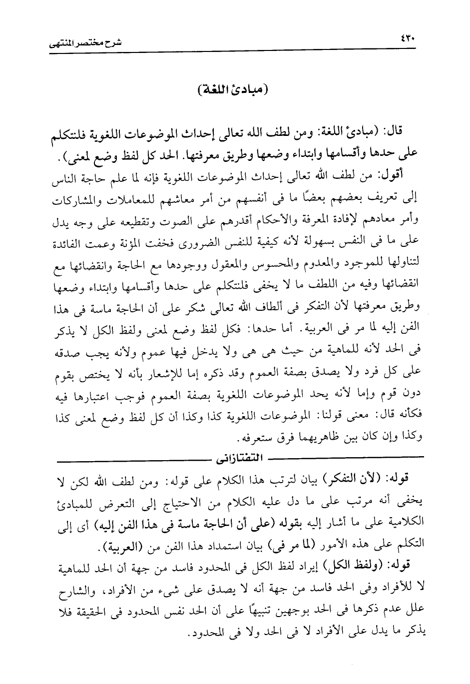 قال: (مبادئ اللغة: ومن لطف اللَّه تعالى إحداث الموضوعات اللغوية فلنتكلم على حدها وأقسامها وابتداء وضعها وطريق معرفتها. الحد كل لفظ وضع لمعنى).