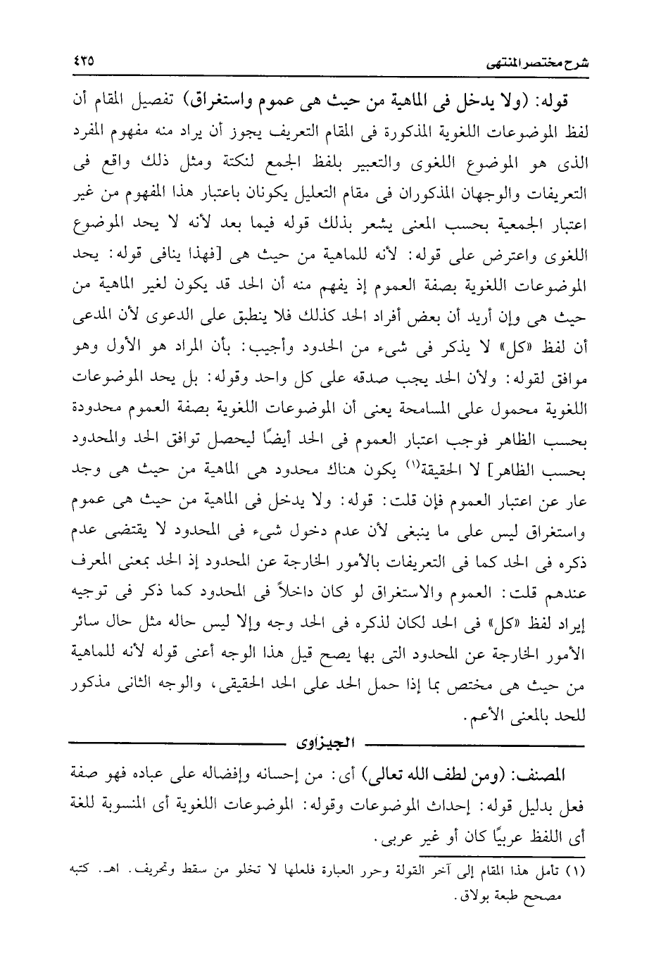 قوله: (ولا يدخل فى الماهية من حيث هى عموم واستغراق) تفصيل المقام أن لفظ الموضوعات اللغوية المذكورة فى المقام التعريف يجوز أن يراد منه مفهوم المفرد الذى هو الموضوع اللغوى والتعبير بلفظ الجمع لنكتة ومثل ذلك واقع فى التعريفات والوجهان المذكوران فى مقام التعليل يكونان باعتبار هذا المفهوم من غير اعتبار الجمعية بحسب المعنى يشعر بذلك قوله فيما بعد لأنه لا يحد الموضوع اللغوى واعترض على قوله: لأنه للماهية من حيث هى [فهذا ينافى قوله: يحد الموضوعات اللغوية بصفة العموم إذ يفهم منه أن الحد قد يكون لغير الماهية من حيث هى وإن أريد أن بعض أفراد الحد كذلك فلا ينطبق على الدعوى لأن المدعى أن لفظ "كل" لا يذكر فى شئ من الحدود وأجيب: بأن المراد هو الأول وهو موافق لقوله: ولأن الحد يجب صدقه على كل واحد وقوله: بل يحد الموضوعات اللغوية محمول على المسامحة يعنى أن الموضوعات اللغوية بصفة العموم محدودة بحسب الظاهر فوجب اعتبار العموم فى الحد أيضًا ليحصل توافق الحد والمحدود بحسب الظاهر] لا الحقيقة (¬١) يكون هناك محدود هى الماهية من حيث هى وجد عار عن اعتبار العموم فإن قلت: قوله: ولا يدخل فى الماهية من حيث هى عموم واستغراق ليس على ما ينبغى لأن عدم دخول شئ فى المحدود لا يقتضى عدم ذكره فى الحد كما فى التعريفات بالأمور الخارجة عن المحدود إذ أحد بمعنى العرف عندهم قلت: العموم والاستغراق لو كان داخلًا فى المحدود كما ذكر فى توجيه إيراد لفظ "كل" فى الحد لكان لذكره فى الحد وجه وإلا ليس حاله مثل حال سائر الأمور الخارجة عن المحدود التى بها يصح قيل هذا الوجه أعنى قوله لأنه للماهية من حيث هى مختص بما إذا حمل الحد على الحد الحقيقى، والوجه الثانى مذكور للحد بالمعنى الأعم.