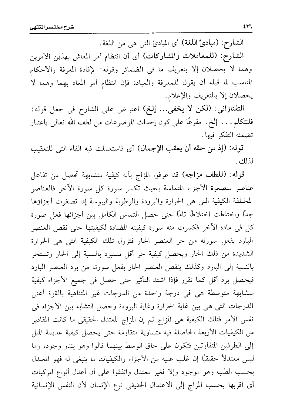 قوله: (للطف مزاجه) قد عرفوا المزاج بأنه كيفية متشابهة تحصل من تفاعل عناصر متصغرة الأجزاء المتماسة بحيث تكسر سورة كل سورة الآخر فالعناصر المختلفة الكيفية التى هى الحرارة والبرودة والرطوبة واليبوسة إذا تصغرت أجزاؤها جدًّا واختلطت اختلاطًا تامًّا حتى حصل التماس الكامل بين أجزائها فعل صورة كل فى مادة الآخر فكسرت منه سورة كيفيته المضادة لكيفيتها حتى نقص العنصر البارد بفعل سورته من حر العنصر الحار فتزول تلك الكيفية التى هى الحرارة الشديدة من ذلك الحار ويحصل كيفية حر أقل تستبرد بالنسبة إلى الحار وتستحر بالنسبة إلى البارد وكذلك ينقص العنصر الحار بفعل سورته من برد العنصر البارد فيحصل برد أقل كما تقرر فإذا اشتد التأثير حتى حصل فى جميع الأجزاء كيفية متشابهة متوسطة هى فى درجة واحدة من الدرجات غير المتناهية بالقوة أعنى الدرجات التى هى بين غاية الحرارة وغاية البرودة وحصل التشابه بين الأجزاء فى نفس الأمر فتلك الكيفية هى المزاج ثم إن المزاج المعتدل الحقيقى ما كانت المقادير من الكيفيات الأربعة الحاصلة فيه متساوية متقاومة حتى يحصل كيفية عديمة الميل إلى الطرفين المتفاوتين فتكون على حاق الوسط بينهما قالوا وهو يندر وجوده وما ليس معتدلًا حقيقيًا إن غلب عليه من الأجزاء والكيفيات ما ينبغى له فهو المعتدل بحسب الطب وهو موجود وإلا فغير معتدل واتفقوا على أن أعدل أنواع المركبات أى أقربها بحسب المزاج إلى الاعتدال الحقيقى نوع الإنسان لأن النفس الإنسانية