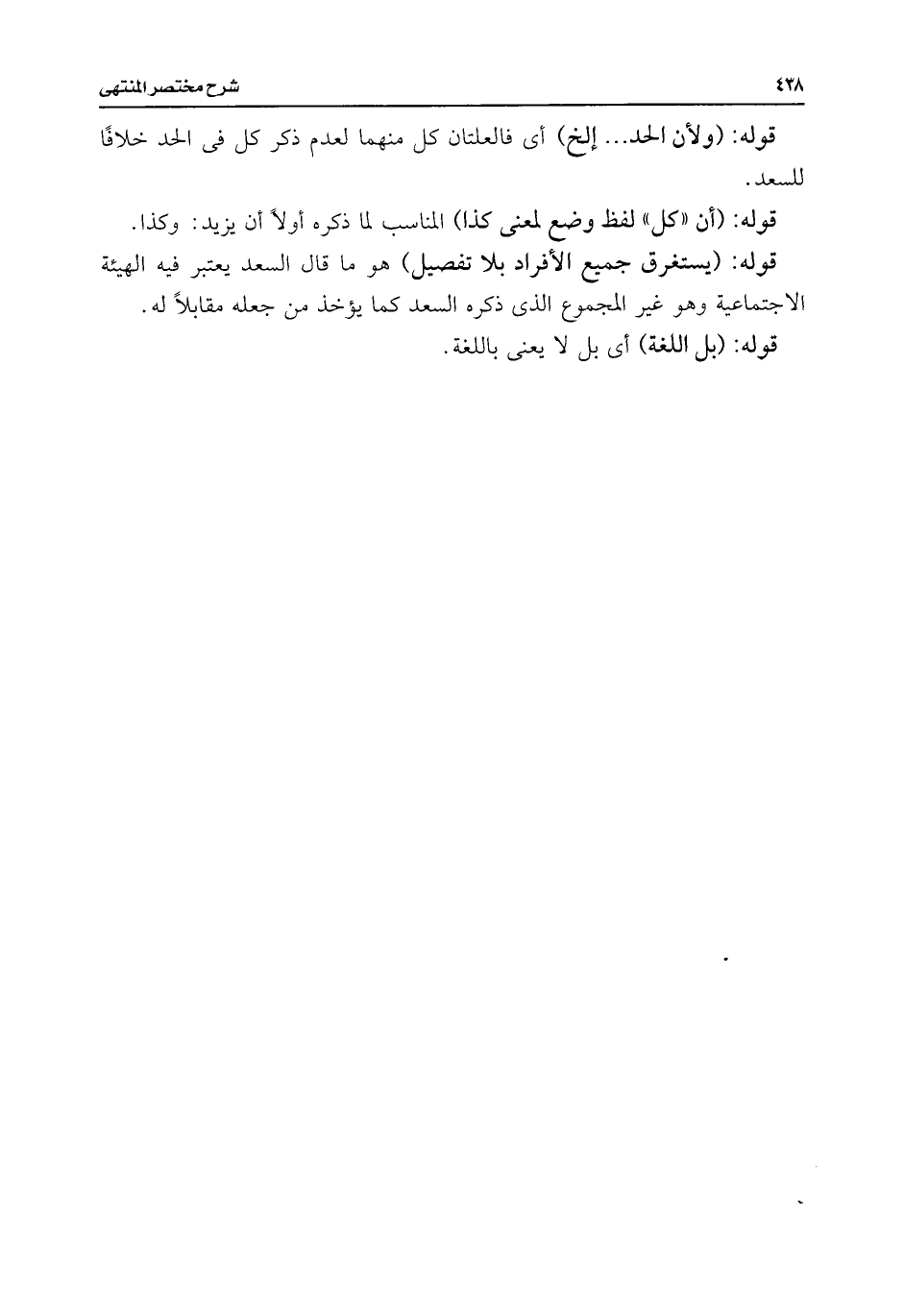 قوله: (يستغرق جميع الأفراد بلا تفصيل) هو ما قال السعد يعتبر فيه الهيئة الاجتماعية وهو غير المجموع الذى ذكره السعد كما يؤخذ من جعله مقابلًا له.
