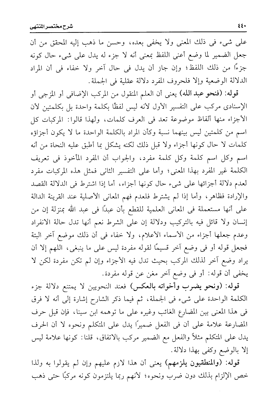 قوله: (فنحو عبد اللَّه) يعنى أن العلم المنقول من المركب الإضافى أو المزجى أو الإسنادى مركب على التفسير الأول لأنه ليس لفظًا بكلية واحدة بل بكلمتين لأن الأجزاء منها ألفاظ موضوعة تعد فى العرف كليات، ولهذا قالوا: المركبات كل اسم من كلمتين ليس بينهما نسبة وكأن المراد بالكلمة الواحدة ما لا يكون أجزاؤه كليات لا حال كونها أجزاء ولا قبل ذلك لكنه يشكل بما أطبق عليه النحاة من أنه اسم وكل اسم كلمة وكل كلمة مفرد، والجواب أن المفرد المأخوذ فى تعريف الكلمة غير المفرد بهذا المعنى؛ وأما على التفسير الثانى فمثل هذه المركبات مفرد لعدم دلالة أجزائها على شئ حال كونها أجزاء، أما إذا اشترط فى الدلالة القصد والإرادة فظاهر، وأما إذا لم يشترط فلعدم فهم المعانى الأصلية عند القرينة الدالة على أنها مستعملة فى المعانى العلمية للقطع بأن عبدًا فى عبد اللَّه بمنزلة إن من إنسان ولا قائل فيه بالتركيب ودلالة إن على الشرط نعم أنها تدل حالة الانفراد وعدم جعلها أجزاء من الأسماء الأعلام، ولا خفاء فى أن ذلك موضوع آخر البتة فجعل قوله أو فى وضع آخر قسيمًا لقوله مفردة ليس على ما ينبغى، اللهم إلا أن يراد وضع آخر لذلك المركب بحيث تدل فيه الأجزاء وإن لم تكن مفردة لكن لا يخفى أن قوله: أو فى وضع آخر مغن من قوله مفردة.