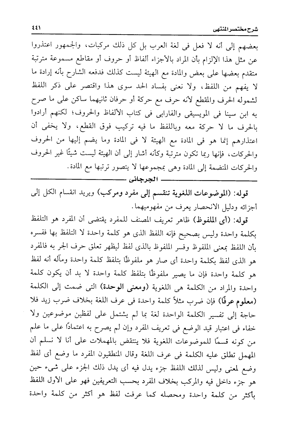 بعضهم إلى أنه لا فعل فى لغة العرب بل كل ذلك مركبات، والجمهور اعتذروا عن مثل هذا الإلزام بأن المراد بالأجزاء ألفاظ أو حروف أو مقاطع مسموعة مترتبة متقدم بعضها على بعض والمادة مع الهيئة ليست كذلك فدفعه الشارح بأنه إرادة ما لا يفهم من اللفظ، ولا نعنى بفساد الحد سوى ما هذا واقتصر على ذكر اللفظ لشموله الحرف والمقطع لأنه حرف مع حركة أو حرفان ثانيهما ساكن على ما صرح به ابن سينا فى المويسيقى والفارابى فى كتاب الألفاظ والحروف؛ لكنهم أرادوا بالحرف ما لا حركة معه وباللفظ ما فيه تركيب فوق القطع، ولا يخفى أن اعتذارهم إنما هو فى المادة مع الهيئة لا فى المادة وما يضم إليها من الحروف والحركات، فإنها ربما تكون مترتبة وكأنه أشار إلى أن الهيئة ليست شيئًا غير الحروف والحركات المنضمة إلى المادة وهى بمجموعها لا يتصور ترتبها مع المادة.