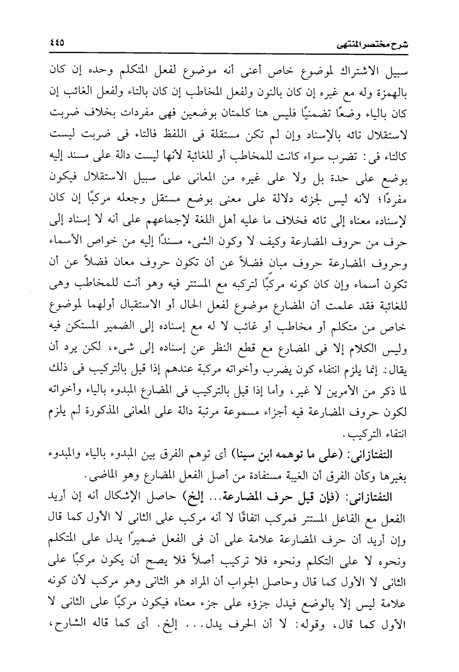التفتازانى: (على ما توهمه ابن سينا) أى توهم الفرق بين المبدوء بالياء والمبدوء بغيرها وكأن الفرق أن الغيبة مستفادة من أصل الفعل المضارع وهو الماضى.