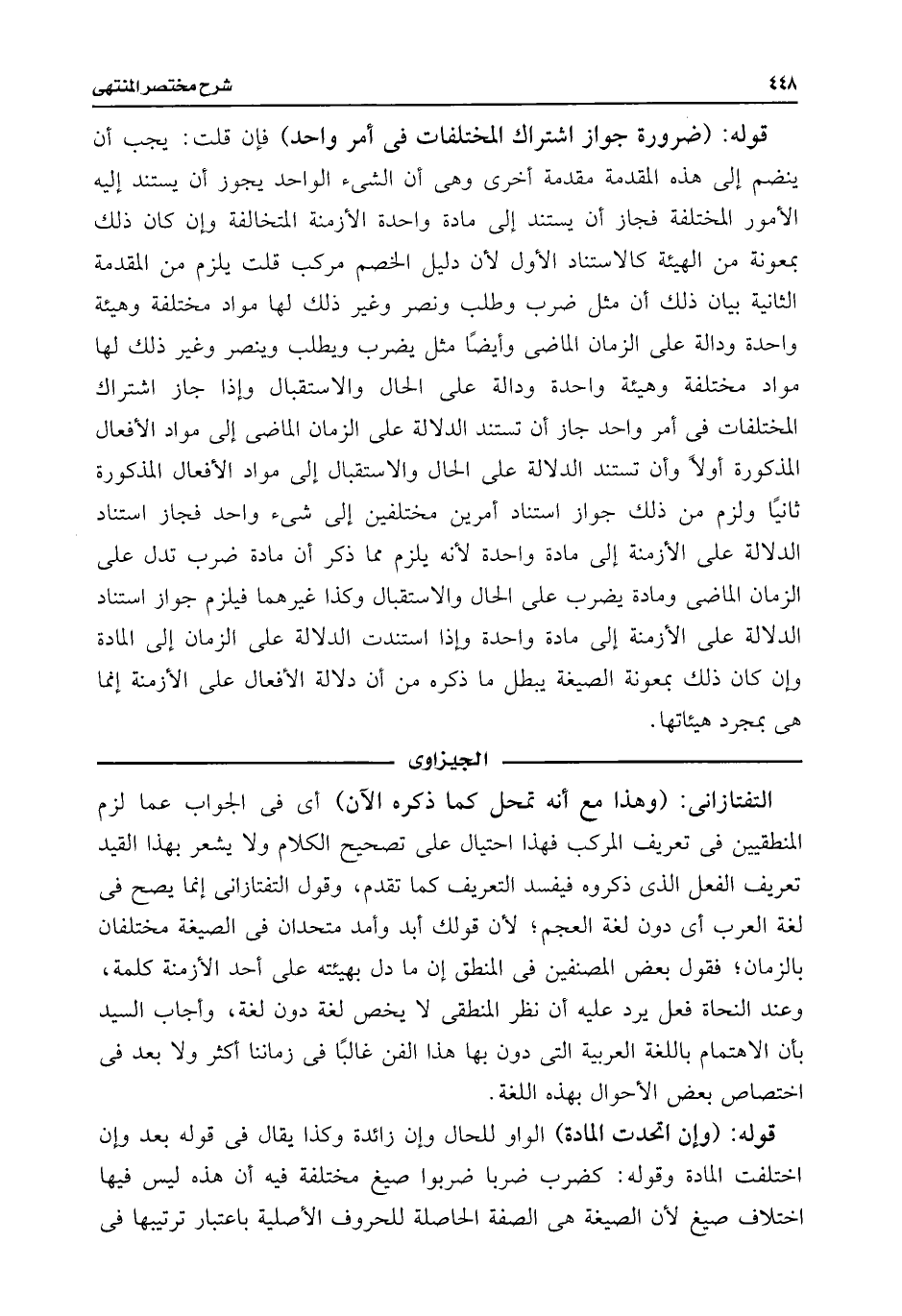 قوله: (ضرورة جواز اشتراك المختلفات فى أمر واحد) فإن قلت: يجب أن ينضم إلى هذه المقدمة مقدمة أخرى وهى أن الشئ الواحد يجوز أن يستند إليه الأمور المختلفة فجاز أن يستند إلى مادة واحدة الأزمنة المتخالفة وإن كان ذلك بمعونة من الهيئة كالاستناد الأول لأن دليل الخصم مركب قلت يلزم من المقدمة الثانية بيان ذلك أن مثل ضرب وطلب ونصر وغير ذلك لها مواد مختلفة وهيئة واحدة ودالة على الزمان الماضى وأيضًا مثل يضرب ويطلب وينصر وغير ذلك لها مواد مختلفة وهيئة واحدة ودالة على الحال والاستقبال وإذا جاز اشتراك المختلفات فى أمر واحد جاز أن تستند الدلالة على الزمان الماضى إلى مواد الأفعال المذكورة أولًا وأن تستند الدلالة على الحال والاستقبال إلى مواد الأفعال المذكورة ثانيًا ولزم من ذلك جواز استناد أمرين مختلفين إلى شئ واحد فجاز استناد الدلالة على الأزمنة إلى مادة واحدة لأنه يلزم مما ذكر أن مادة ضرب تدل على الزمان الماضى ومادة يضرب على الحال والاستقبال وكذا غيرهما فيلزم جواز استناد الدلالة على الأزمنة إلى مادة واحدة وإذا استندت الدلالة على الزمان إلى المادة وإن كان ذلك بمعونة الصيغة يبطل ما ذكره من أن دلالة الأفعال على الأزمنة إنما هى بمجرد هيئاتها.