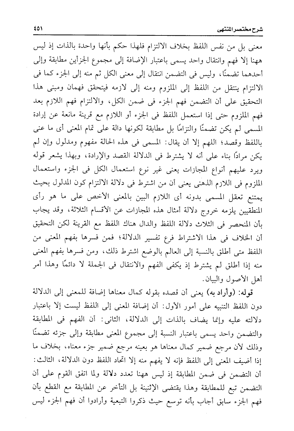 معنى بل من نفس اللفظ بخلاف الالتزام فهذا حكم بأنها واحدة بالذات إذ ليس ههنا إلا فهم وانتقال واحد يسمى باعتبار الإضافة إلى مجموع الجزأين مطابقة وإلى أحدهما تضمنًا، وليس فى التضمن انتقال إلى معنى الكل ثم منه إلى الجزء كما فى الالتزام ينتقل من اللفظ إلى اللزوم ومنه إلى لازمه فيتحقق فهمان ومبنى هذا التحقيق على أن التضمن فهم الجزء فى ضمن الكل، والالتزام فهم اللازم بعد فهم الملزوم حتى إذا استعمل اللفظ فى الجزء أو اللازم مع قرينة مانعة عن إرادة المسمى لم يكن تضمنًا والتزامًا بل مطابقة لكونها دالة على تمام المعنى أى ما عنى باللفظ وقصد، اللهم إلا أن يقال: المسمى فى هذه الحالة مفهوم ومدلول وإن لم يكن مرادًا بناء على أنه لا يشترط فى الدلالة القصد والإرادة، وبهذا يشعر قوله ويرد عليهم أنواع المجازات يعنى غير نوع استعمال الكل فى الجزء واستعمال الملزوم فى اللازم الذهنى يعنى أن من اشترط فى دلالة الالتزام كون المدلول بحيث يمتنع تعقل المسمى بدونه أى اللازم البين بالمعنى الأخص على ما هو رأى المنطقيين يلزمه خروج دلالة أمثال هذه المجازات عن الأقسام الثلاثة، وقد يجاب بأن المنحصر فى الثلاث دلالة اللفظ والدال هناك اللفظ مع القرينة لكن التحقيق أن الخلاف فى هذا الاشتراط فرع تفسير الدلالة؛ فمن فسرها بفهم المعنى من اللفظ متى أطلق بالنسبة إلى العالم بالوضع اشترط ذلك، ومن فسرها بفهم المعنى منه إذا أطلق لم يشترط إذ يكفى الفهم والانتقال فى الجملة لا دائمًا وهذا أمر أهل الأصول والبيان.