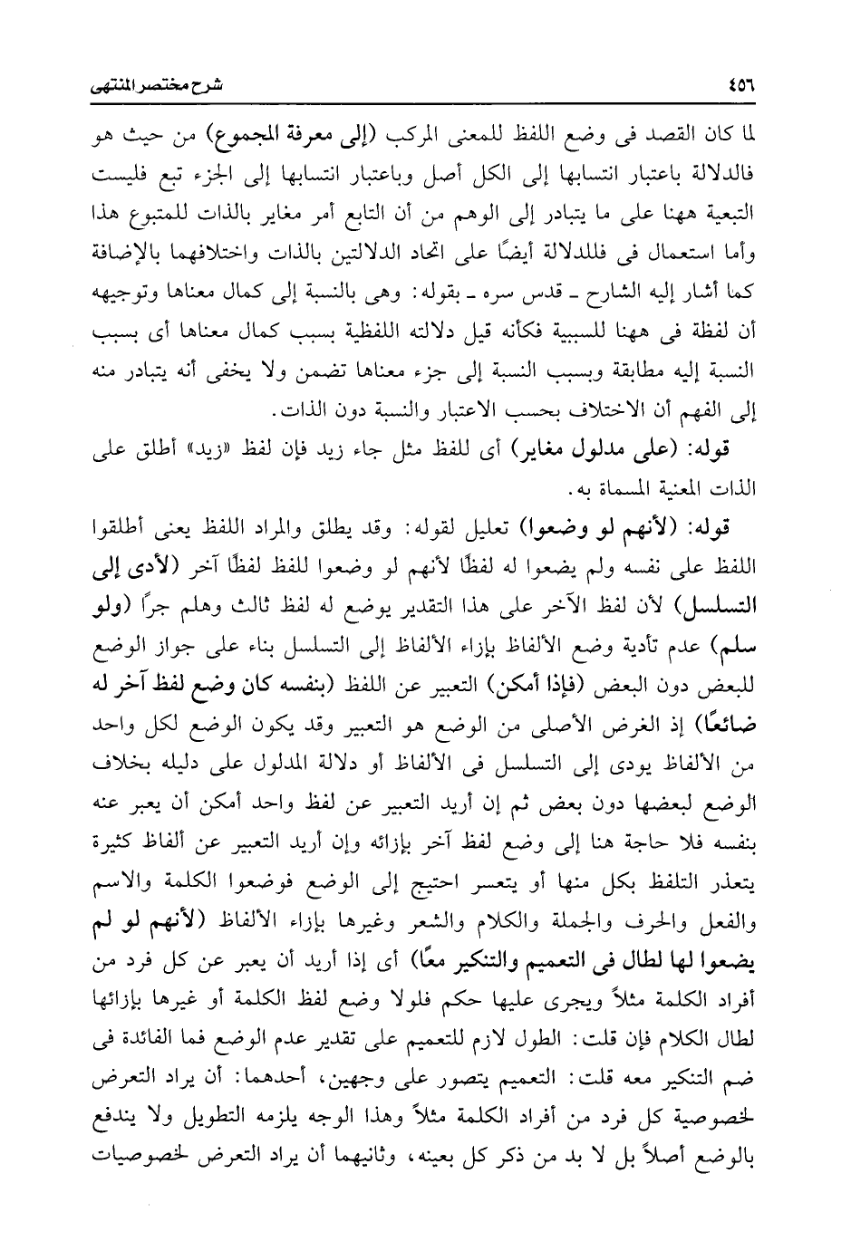 قوله: (لأنهم لو وضعوا) تعليل لقوله: وقد يطلق والمراد اللفظ يعنى أطلقوا اللفظ على نفسه ولم يضعوا له لفظًا لأنهم لو وضعوا للفظ لفظًا آخر (لأدى إلى التسلسل) لأن لفظ الآخر على هذا التقدير يوضع له لفظ ثالث وهلم جرًا (ولو سلم) عدم تأدية وضع الألفاظ بإزاء الألفاظ إلى التسلسل بناء على جواز الوضع للبعض دون البعض (فإذا أمكن) التعبير عن اللفظ (بنفسه كان وضع لفظ آخر له ضائعًا) إذ الغرض الأصلى من الوضع هو التعبير وقد يكون الوضع لكل واحد من الألفاظ يودى إلى التسلسل فى الألفاظ أو دلالة المدلول على دليله بخلاف الوضع لبعضها دون بعض ثم إن أريد التعبير عن لفظ واحد أمكن أن يعبر عنه بنفسه فلا حاجة هنا إلى وضع لفظ آخر بإزائه وإن أريد التعبير عن ألفاظ كثيرة يتعذر التلفظ بكل منها أو يتعسر احتيج إلى الوضع فوضعوا الكلمة والاسم والفعل والحرف والجملة والكلام والشعر وغيرها بإزاء الألفاظ (لأنهم لو لم يضعوا لها لطال فى التعميم والتنكير معًا) أى إذا أريد أن يعبر عن كل فرد من أفراد الكلمة مثلًا ويجرى عليها حكم فلولا وضع لفظ الكلمة أو غيرها بإزائها لطال الكلام فإن قلت: الطول لازم للتعميم على تقدير عدم الوضع فما الفائدة فى ضم التنكير معه قلت: التعميم يتصور على وجهين، أحدهما: أن يراد التعرض لخصوصية كل فرد من أفراد الكلمة مثلًا وهذا الوجه يلزمه التطويل ولا يندفع بالوضع أصلًا بل لا بد من ذكر كل بعينه، وثانيهما أن يراد التعرض لخصوصيات