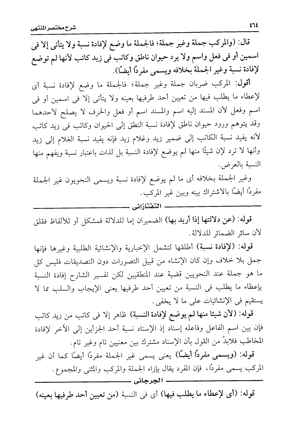 أقول: المركب ضربان جملة وغير جملة؛ فالجملة ما وضع لإفادة نسبة أى لإعطاء ما يطلب فيها من تعيين أحد طرفيها بعينه ولا يتأتى إلا فى اسمين أو فى اسم وفعل لأن المسند إليه اسم والمسند اسم أو فعل والحرف لا يصلح لأحدهما وقد يتوهم ورود حيوان ناطق لإفادة نسبة النطق إلى الحيوان وكاتب فى زيد كاتب لأنه يفيد نسبة الكاتب إلى ضمير زيد وغلام زيد فإنه يفيد نسبة الغلام إلى زيد وأنها لا ترد لإن شيئًا منها لم يوضع لإفادة النسبة بل لذات باعتبار نسبة ويفهم منها النسبة بالعرض.