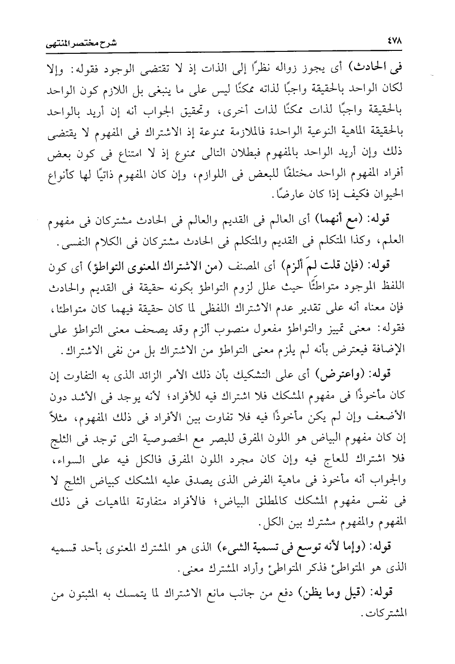 قوله: (واعترض) أى على التشكيك بأن ذلك الأمر الزائد الذى به التفاوت إن كان مأخوذًا فى مفهوم المشكك فلا اشتراك فيه للأفراد؛ لأنه يوجد فى الأشد دون الأضعف وإن لم يكن مأخوذًا فيه فلا تفاوت بين الأفراد فى ذلك المفهوم، مثلًا إن كان مفهوم البياض هو اللون المفرق للبصر مع الخصوصية التى توجد فى الثلج فلا اشتراك للعاج فيه وإن كان مجرد اللون المفرق فالكل فيه على السواء، والجواب أنه مأخوذ فى ماهية الفرض الذى يصدق عليه المشكك كبياض الثلج لا فى نفس مفهوم المشكك كالمطلق البياض؛ فالأفراد متفاوتة الماهيات فى ذلك المفهوم والمفهوم مشترك بين الكل.