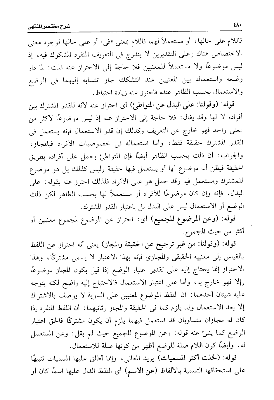 فاللام على حالها، أو مستعملًا لهما فاللام بمعنى "فى" أو على حالها لوجود معنى الاختصاص هناك وعلى التقديرين لا يندرج فى التعريف المنفرد المشكوك فيه، إذ ليس موضوعًا ولا مستعملًا للمعنيين فلا حاجة إلى الاحتراز عنه قلت: لما دار وضعه واستعماله بين المعنيين عند التشكك جاز انتسابه إليهما فى الوضع والاستعمال بحسب الظاهر عنده فاحترز عنه زيادة احتياط.