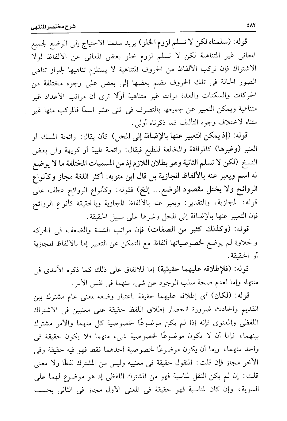 قوله: (سلمناه لكن لا نسلم لزوم الخلو) يريد سلمنا الاحتياج إلى الوضع لجميع المعانى غير المتناهية لكن لا نسلم لزوم خلو بعض المعانى عن الألفاظ لولا الاشتراك فإن تركب الألفاظ من الحروف المتناهية لا يستلزم تناهيها لجواز تناهى الصور الحالة فى تلك الحروف بضم بعضها إلى بعض على وجوه مختلفة من الحركات والسكنات والعدة مرات غير متناهية أوَلا ترى أن مراتب الأعداد غير متناهية ويمكن التعبير عن جميعها بالتصرف فى اثنى عشر اسمًا فالمركب منها غير متناه لاختلاف وجوه التأليف فما ذكرناه أولى.