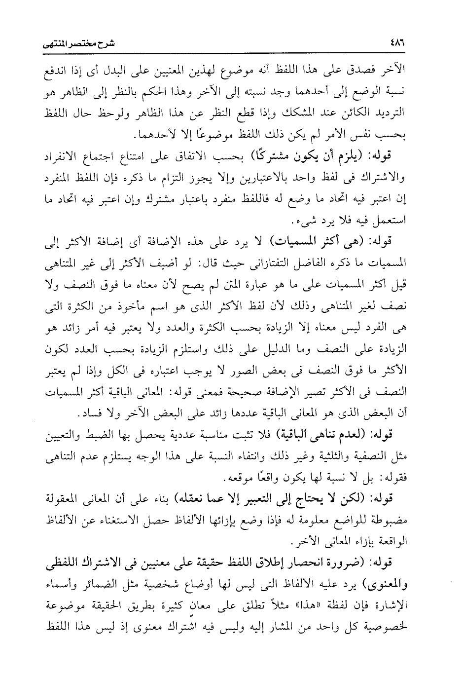 قوله: (هى أكثر المسميات) لا يرد على هذه الإضافة أى إضافة الأكثر إلى المسميات ما ذكره الفاضل التفتازانى حيث قال: لو أضيف الأكثر إلى غير المتناهى قيل أكثر المسميات على ما هو عبارة المتن لم يصح لأن معناه ما فوق النصف ولا نصف لغير المتناهى وذلك لأن لفظ الأكثر الذى هو اسم مأخوذ من الكثرة التى هى الفرد ليس معناه إلا الزيادة بحسب الكثرة والعدد ولا يعتبر فيه أمر زائد هو الزيادة على النصف وما الدليل على ذلك واستلزم الزيادة بحسب العدد لكون الأكثر ما فوق النصف فى بعض الصور لا يوجب اعتباره فى الكل وإذا لم يعتبر النصف فى الأكثر تصير الإضافة صحيحة فمعنى قوله: المعانى الباقية أكثر المسميات أن البعض الذى هو المعانى الباقية عددها زائد على البعض الآخر ولا فساد.
