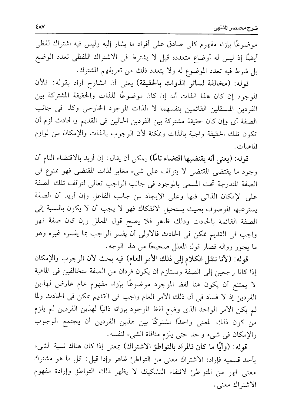 قوله: (لأنا ننقل الكلام إلى ذلك الأمر العام) فيه بحث لأن الوجوب والإمكان إذا كانا راجعين إلى الصفة ويستلزم أن يكون فردان من الصفة متخالفين فى الماهية لا يمتنع أن يكون هنا لفظ الموجود موضوعًا بإزاء مفهوم عام عارض لهذين الفردين إذ لا فساد فى أن ذلك الأمر العام واجب فى القديم ممكن فى الحادث ولما لم يكن الأمر الواحد الذى وضع لفظ الموجود بإزائه ذاتيًا لهذين الفردين لم يلزم من كون ذلك المعنى واحدًا مشتركًا بين هذين الفردين أن يجتمع الوجوب والإمكان فى شئ واحد حتى يلزم منافاة الشئ لنفسه.