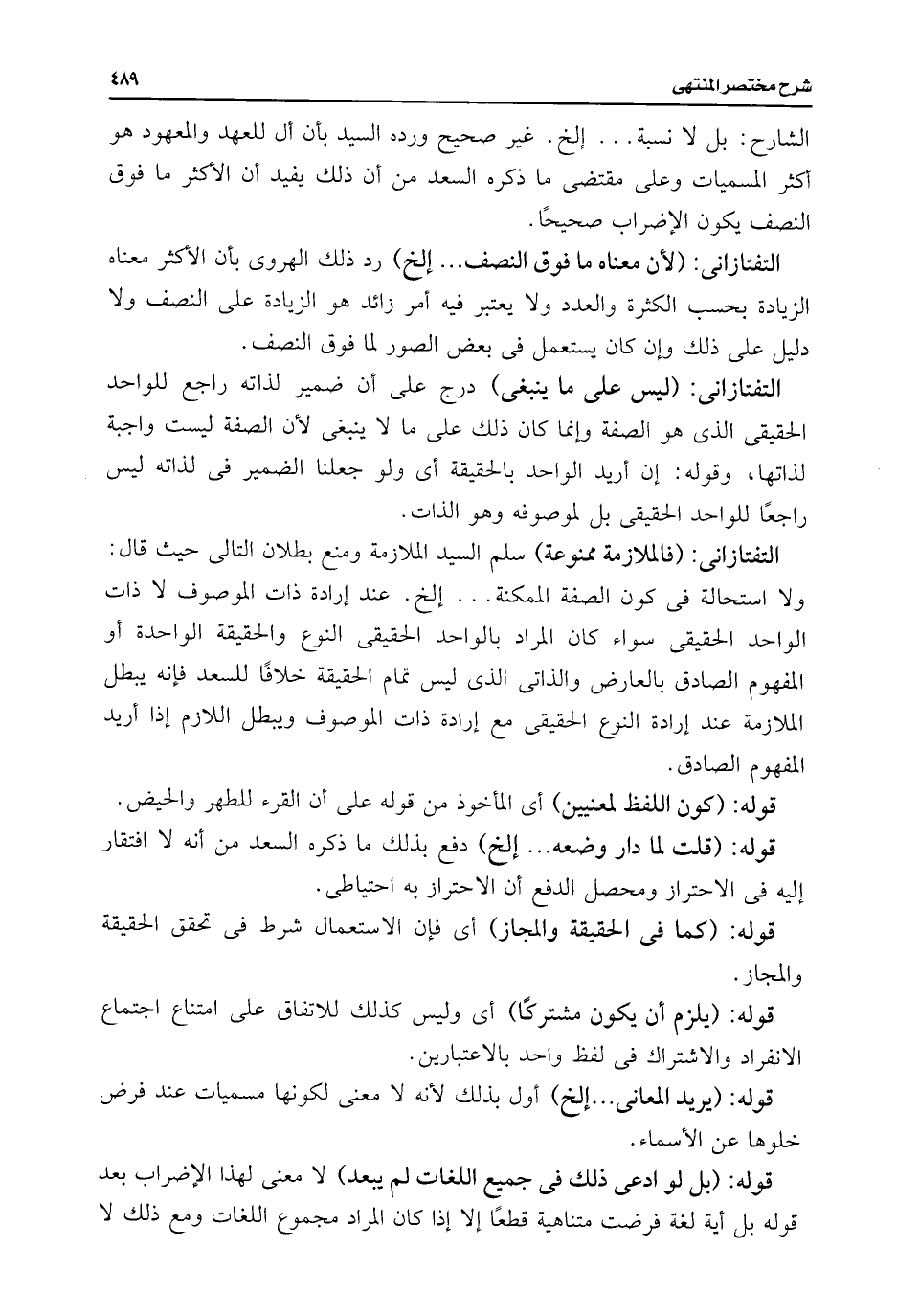 التفتازانى: (لأن معناه ما فوق النصف. . . إلخ) رد ذلك الهروى بأن الأكثر معناه الزيادة بحسب الكثرة والعدد ولا يعتبر فيه أمر زائد هو الزيادة على النصف ولا دليل على ذلك وإن كان يستعمل فى بعض الصور لما فوق النصف.
