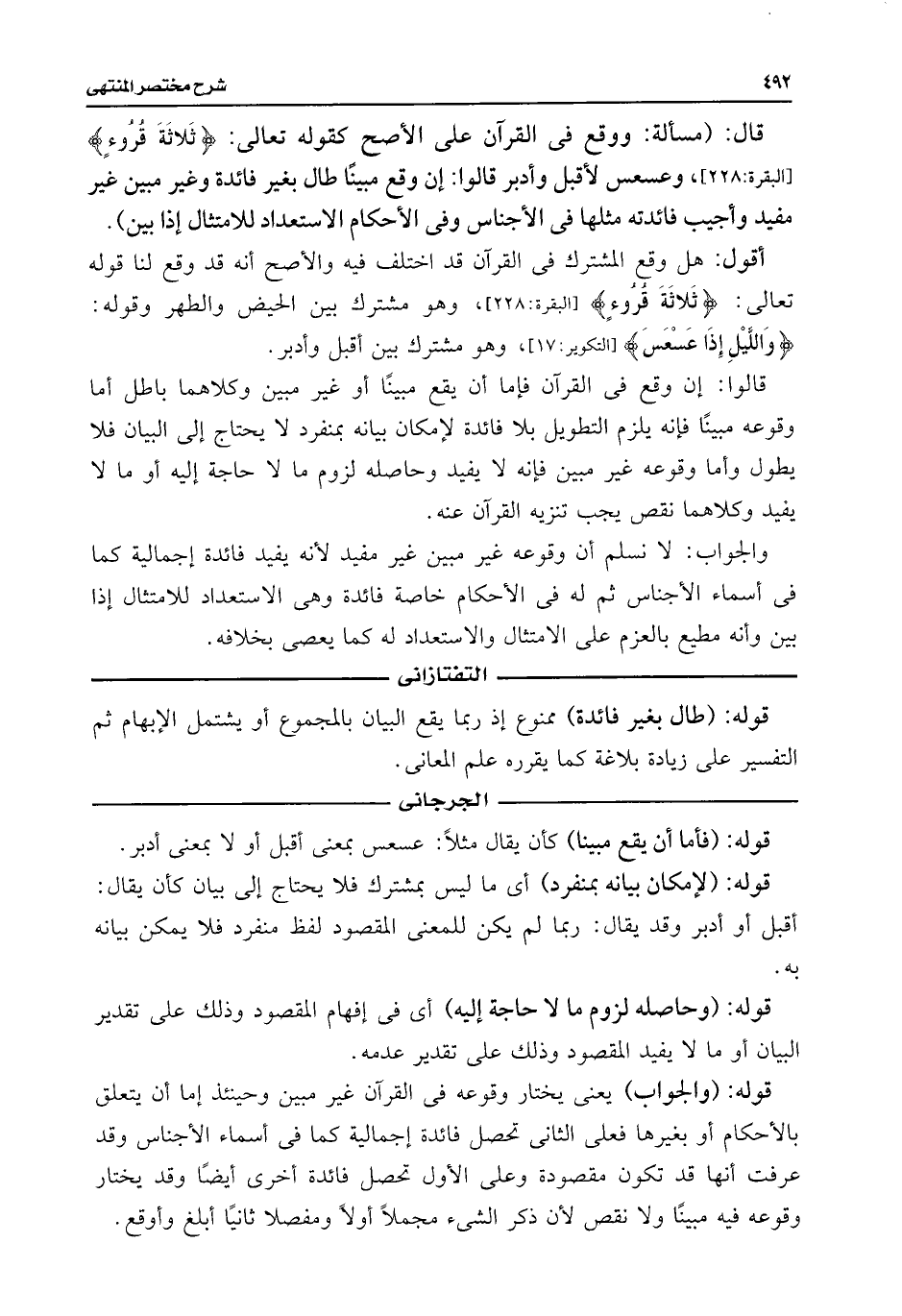 قال: (مسألة: ووقع فى القرآن على الأصح كقوله تعالى: {ثَلَاثَةَ قُرُوءٍ} [البقرة: ٢٢٨]، وعسعس لأقبل وأدبر قالوا: إن وقع مبينًا طال بغير فائدة وغير مبين غير مفيد وأجيب فائدته مثلها فى الأجناس وفى الأحكام الاستعداد للامتثال إذا بين).