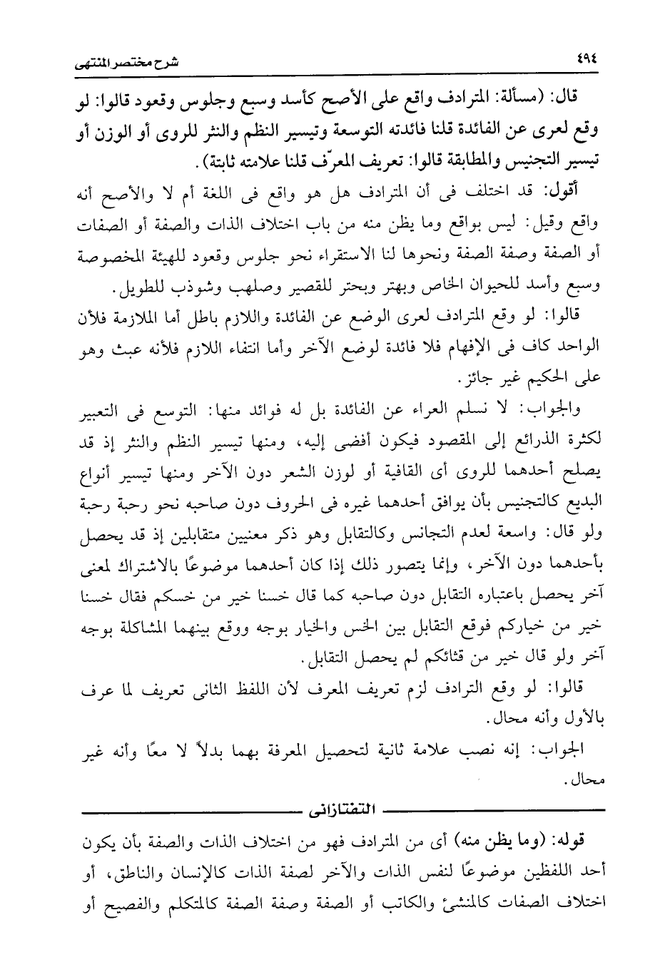 قال: (مسألة: المترادف واقع على الأصح كأسد وسبع وجلوس وقعود قالوا: لو وقع لعرى عن الفائدة قلنا فائدته التوسعة وتيسير النظم والنثر للروى أو الوزن أو تيسير التجنيس والمطابقة قالوا: تعريف المعرّف قلنا علامته ثابتة).