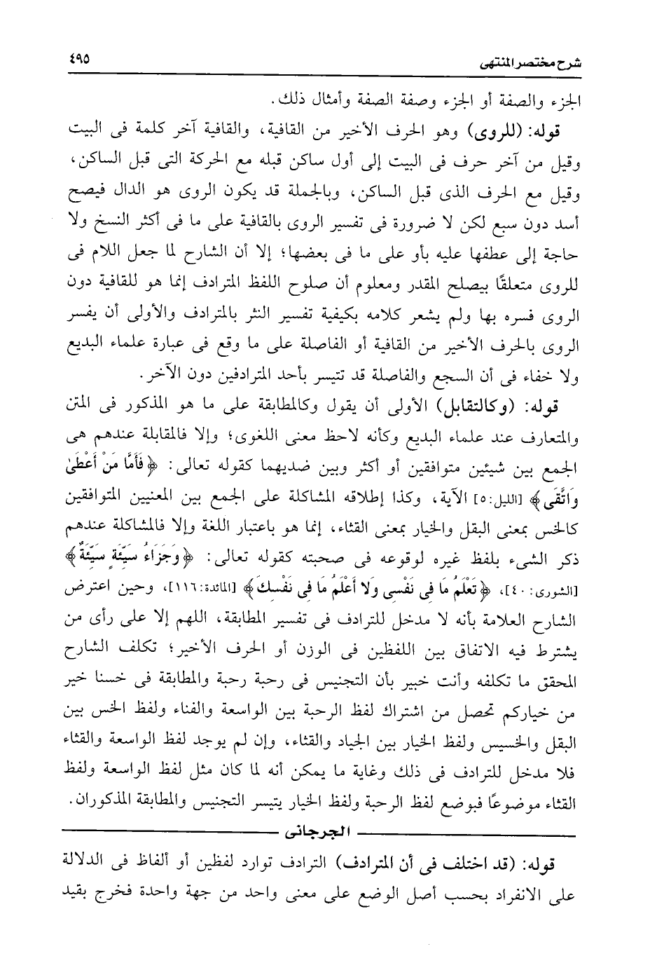 قوله: (للروى) وهو الحرف الأخير من القافية، والقافية آخر كلمة فى البيت وقيل من آخر حرف فى البيت إلى أول ساكن قبله مع الحركة التى قبل الساكن، وقيل مع الحرف الذى قبل الساكن، وبالجملة قد يكون الروى هو الدال فيصح أسد دون سبع لكن لا ضرورة فى تفسير الروى بالقافية على ما فى أكثر النسخ ولا حاجة إلى عطفها عليه بأو على ما فى بعضها؛ إلا أن الشارح لما جعل اللام فى للروى متعلقًا بيصلح المقدر ومعلوم أن صلوح اللفظ المترادف إنما هو للقافية دون الروى فسره بها ولم يشعر كلامه بكيفية تفسير النثر بالمترادف والأولى أن يفسر الروى بالحرف الأخير من القافية أو الفاصلة على ما وقع فى عبارة علماء البديع ولا خفاء فى أن السجع والفاصلة قد تتيسر بأحد المترادفين دون الآخر.