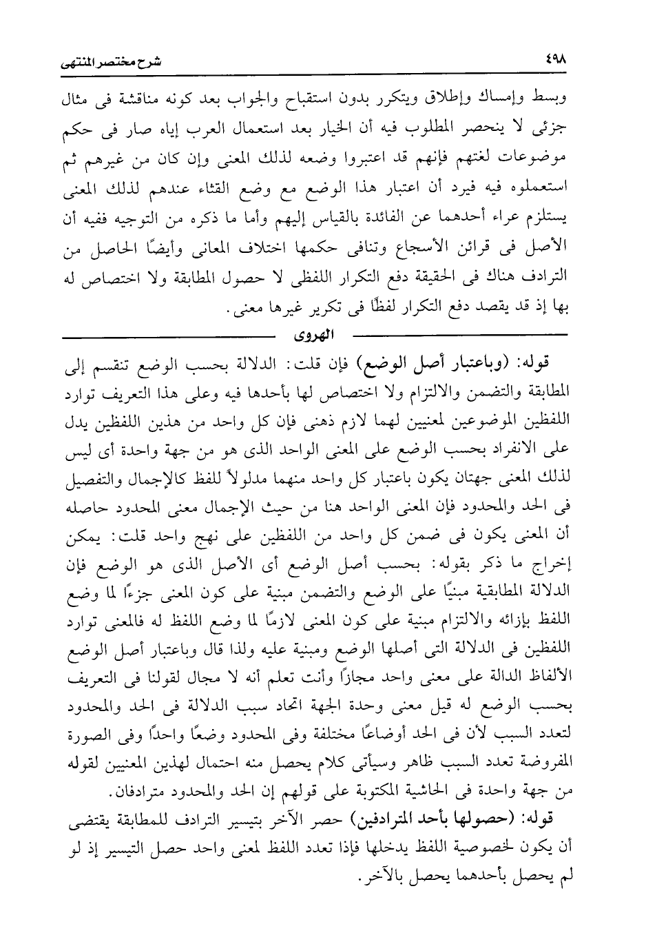 قوله: (حصولها بأحد المترادفين) حصر الآخر بتيسير الترادف للمطابقة يقتضى أن يكون لخصوصية اللفظ يدخلها فإذا تعدد اللفظ لمعنى واحد حصل التيسير إذ لو لم يحصل بأحدهما يحصل بالآخر.
