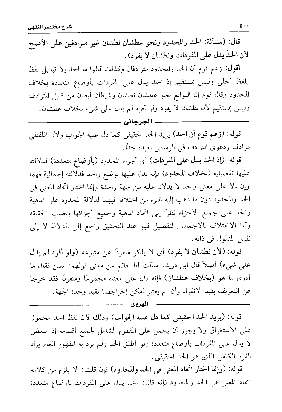 أقول: زعم قوم أن الحد والمحدود مترادفان وكذلك قالوا ما الحد إلا تبديل لفظ بلفظ أحلى وليس بمستقيم إذ الحدّ يدل على المفردات بأوضاع متعددة بخلاف المحدود وقال قوم إن التوابع نحو عطشان نطشان وشيطان ليطان من قبيل المترادف وليس بمستقيم لأن نطشان لا يفرد ولو أفرد لم يدل على شئ بخلاف عطشان.