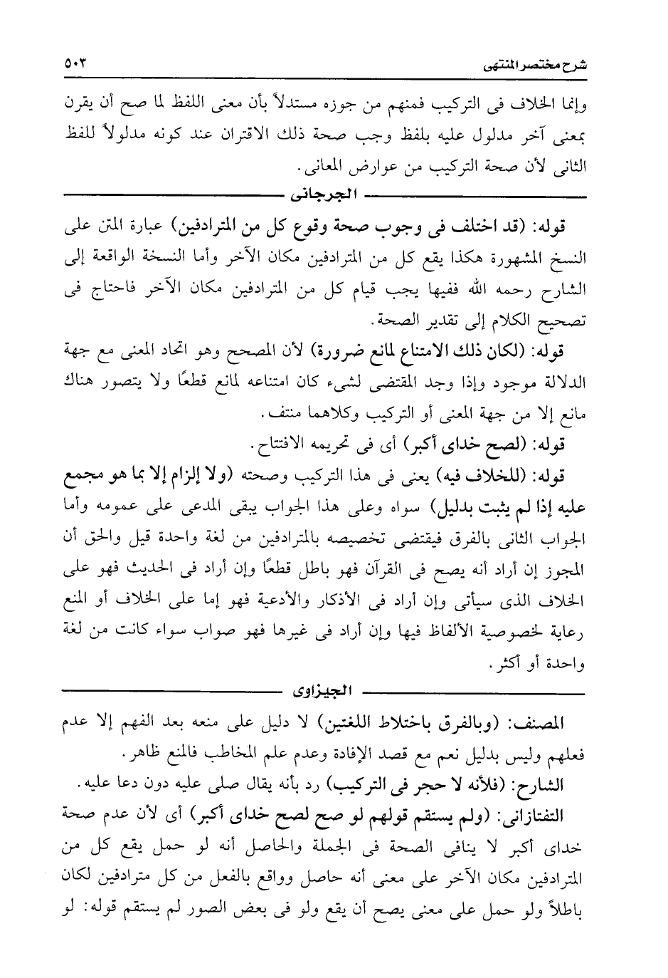 التفتازانى: (ولم يستقم قولهم لو صح لصح خداى أكبر) أى لأن عدم صحة خداى أكبر لا ينافى الصحة فى الجملة والحاصل أنه لو حمل يقع كل من المترادفين مكان الآخر على معنى أنه حاصل وواقع بالفعل من كل مترادفين لكان باطلًا ولو حمل على معنى يصح أن يقع ولو فى بعض الصور لم يستقم قوله: لو