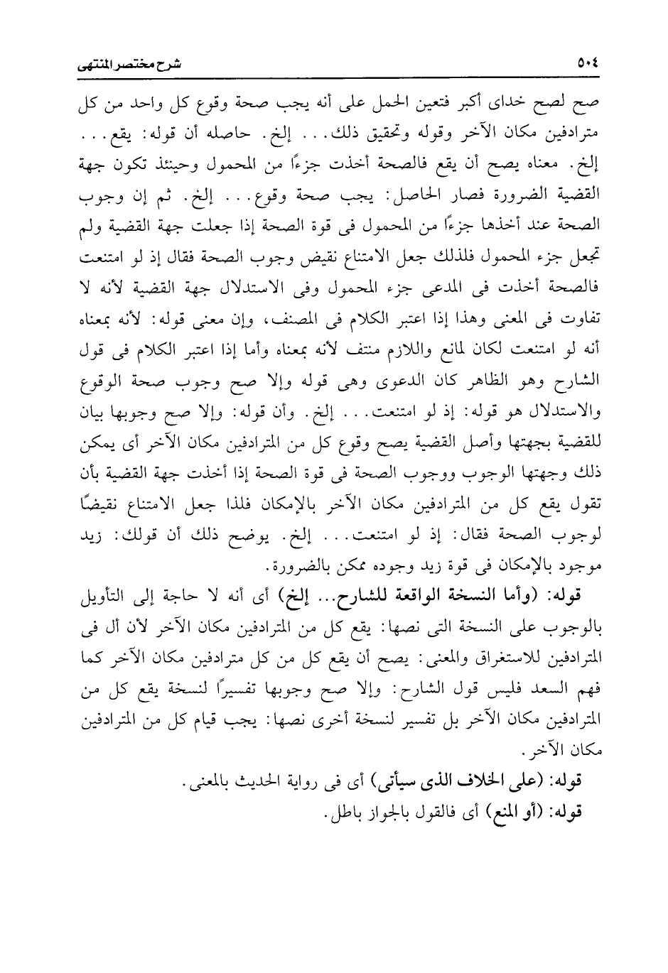 صح لصح خداى أكبر فتعين الحمل على أنه يجب صحة وقوع كل واحد من كل مترادفين مكان الآخر وقوله وتحقيق ذلك. . . إلخ. حاصله أن قوله: يقع. . . إلخ. معناه يصح أن يقع فالصحة أخذت جزءًا من المحمول وحينئذ تكون جهة القضية الضرورة فصار الحاصل: يجب صحة وقوع. . . إلخ ثم إن وجوب الصحة عند أخذها جزءًا من المحمول فى قوة الصحة إذا جعلت جهة القضية ولم تجعل جزء المحمول فلذلك جعل الامتناع نقيض وجوب الصحة فقال إذ لو امتنعت فالصحة أخذت فى المدعى جزء المحمول وفى الاستدلال جهة القضية لأنه لا تفاوت فى المعنى وهذا إذا اعتبر الكلام فى المصنف، وإن معنى قوله: لأنه بمعناه أنه لو امتنعت لكان لمانع واللازم منتف لأنه بمعناه وأما إذا اعتبر الكلام فى قول الشارح وهو الظاهر كان الدعوى وهى قوله وإلا صح وجوب صحة الوقوع والاستدلال هو قوله: إذ لو امتنعت. . . إلخ. وأن قوله: وإلا صح وجوبها بيان للقضية بجهتها وأصل الترضية يصح وقوع كل من المترادفين مكان الآخر أى يمكن ذلك وجهتها الوجوب ووجوب الصحة فى قوة الصحة إذا أخذت جهة القضية بأن تقول يقع كل من المترادفين مكان الآخر بالإمكان فلذا جعل الامتناع نقيضًا لوجوب الصحة فقال: إذ لو امتنعت. . . إلخ. يوضح ذلك أن قولك: زيد موجود بالإمكان فى قوة زيد وجوده ممكن بالضرورة.