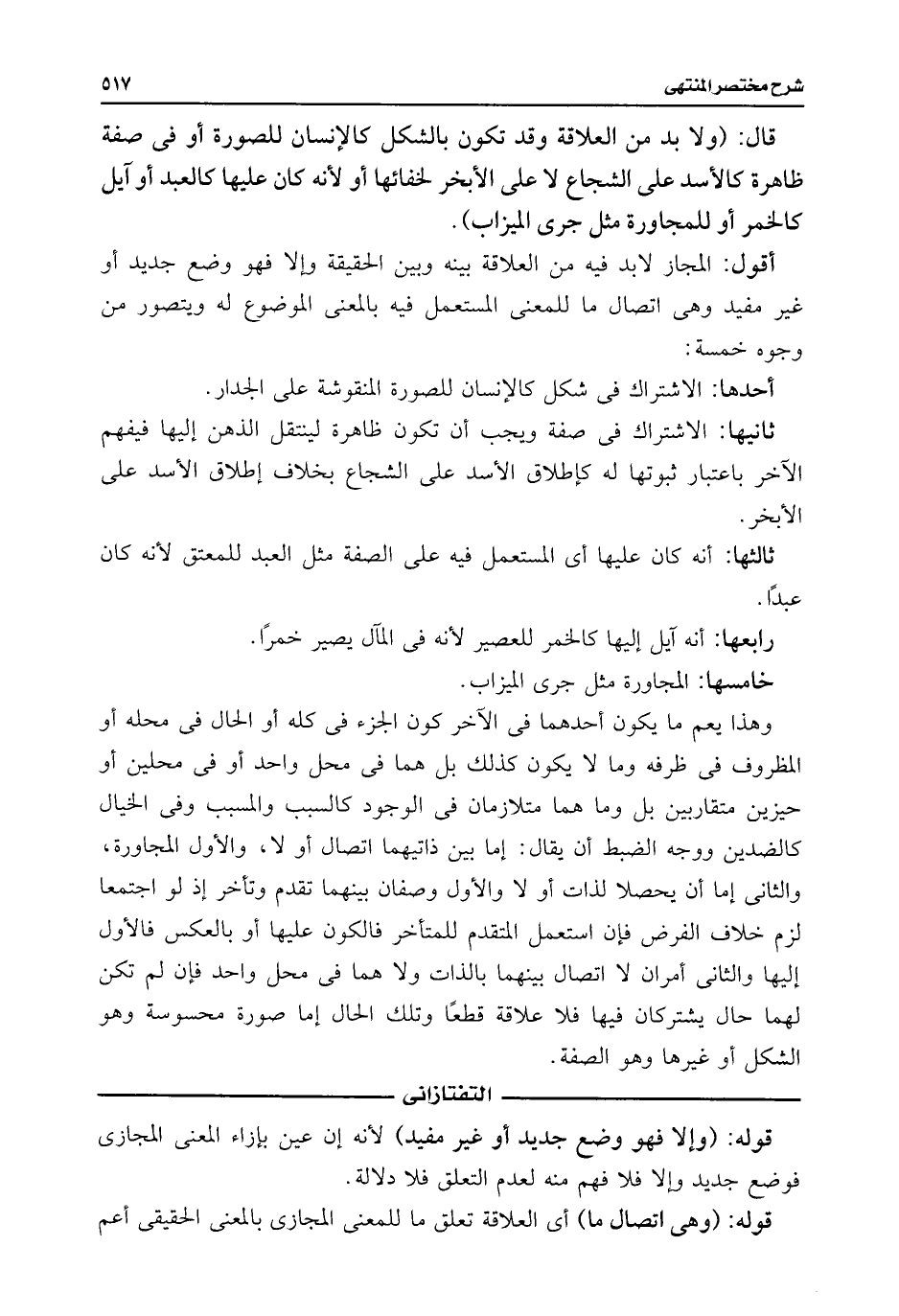 وهذا يعم ما يكون أحدهما فى الآخر كون الجزء فى كله أو الحال فى محله أو المظروف فى ظرفه وما لا يكون كذلك بل هما فى محل واحد أو فى محلين أو حيزين متقاربين بل وما هما متلازمان فى الوجود كالسبب والمسبب وفى الخيال كالضدين ووجه الضبط أن يقال: إما بين ذاتيهما اتصال أو لا، والأول المجاورة، والثانى إما أن يحصلا لذات أو لا والأول وصفان بينهما تقدم وتأخر إذ لو اجتمعا لزم خلاف الفرض فإن استعمل المتقدم للمتأخر فالكون عليها أو بالعكس فالأول إليها والثانى أمران لا اتصال بينهما بالذات ولا هما فى محل واحد فإن لم تكن لهما حال يشتركان فيها فلا علاقة قطعًا وتلك الحال إما صورة محسوسة وهو الشكل أو غيرها وهو الصفة.